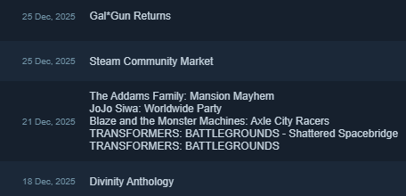 Haven't been gifted, but it's not a big deal. Hope you all had a Merry Christmas. Spent the day watching Christmas movies with the family and I'm currently building some Lego and watching Home Alone 2. steamcommunity.com/id/JTman620/store.steampowered.com/wishlist/id/JTman620/