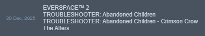 The Alters was fun, already finished it, would easily recommend it, kind of tempted to start another playthrough to get other endings/pick different choices/Alters.Troubleshooters's pacing feels really slow, played a few hours of it and I only have 3 characters so far, it kind of made me just want to replay XCOM instead.Everspace 2 feels kind of shallow and repetitive, not really what I was expecting.