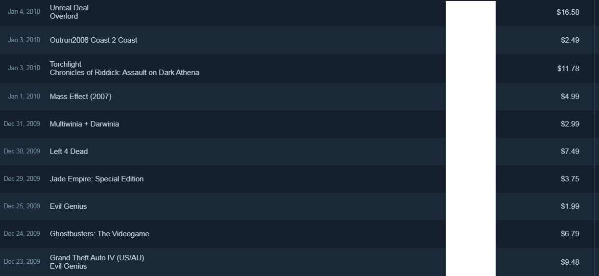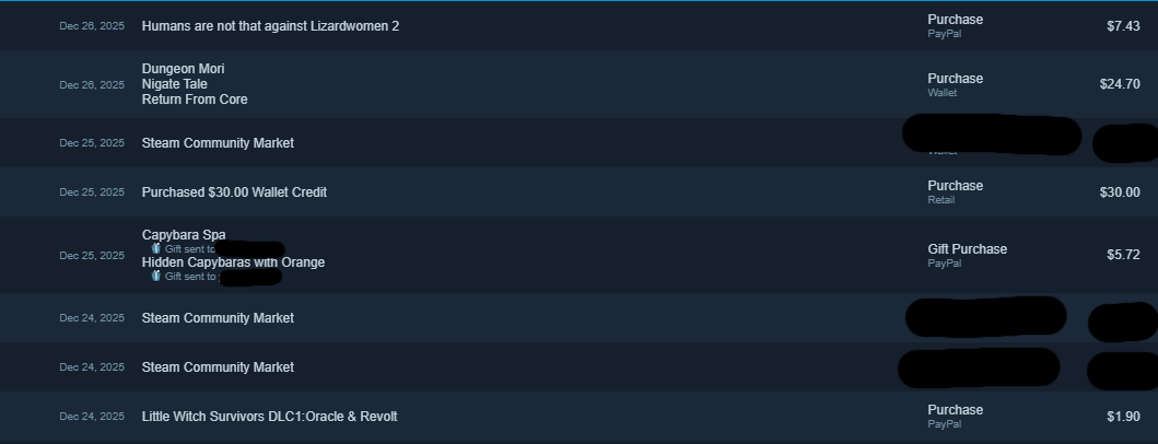 >ALL the hitman games>Rayman raving rabbits>Pigface>Sushi cat legacy collection>cult of the lamb>gloomwood>Indian jones>cataclismo>frogmonster>Hatred>Trine 2>Human resource machineSo like $250 right now might buy more. $300 sounds like a good number. Also I'm a linux gamer such as context so I see it as me paying for more linux support. I also have a good job and go to the gym 7 times a week, pull push x 2 and legs and cardio. That is my defense against smarmy reddit comments. I have money and am fit so fuck off.