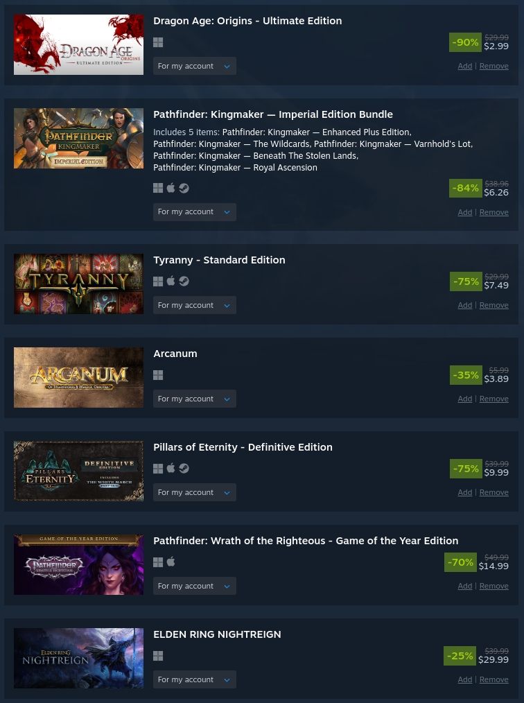 >>729369901My backlog from last year is mostly untouched because my drives were full. This year I got>disgaea on another site for 3 euro>slay the spire for 3>maybe stoneshard or some ubislopI still feel like i am spending too much. But odyssey for 9,99 if I can find more ubislop to bundle it with is nice.
