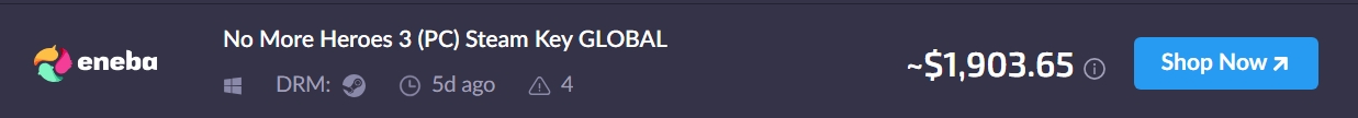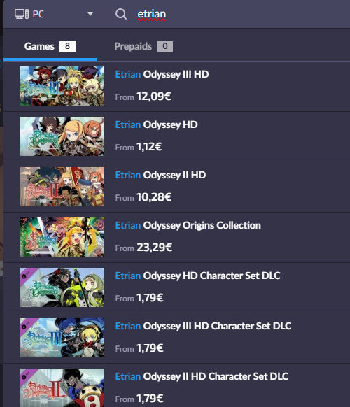 >>729370584>snatch an etrian odyssey codeGame is very cheap (at least 1st one is) on 3rd party sites>>729349821And Dark Souls 2 is (12,85e) and DS3 (18,91e)https://gg.deals/pc/ (just make sure to select correct region)