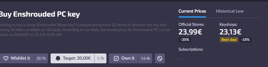 I have 27e and i think i will get Enshrouded so i set an alarm for it when it hits 20e or hopefully below i pirated it and played it for like 5mins and it seemed fun (solo)