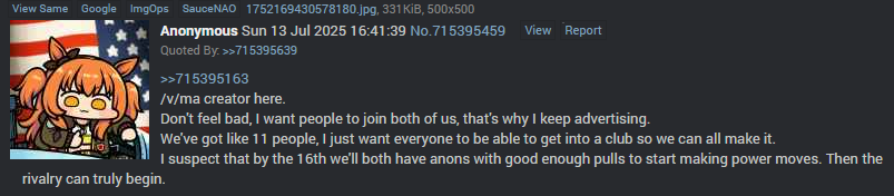 >>729357194vivlos mentioned poster only appears when well... she gets mentioned. Coatless tachyanon finally got her three star a long while back. NTR anon is /v/ma's Haru and doesn't just copy paste messages. It's only WV anon and Obeyfag ritual posting to the point of annoyance