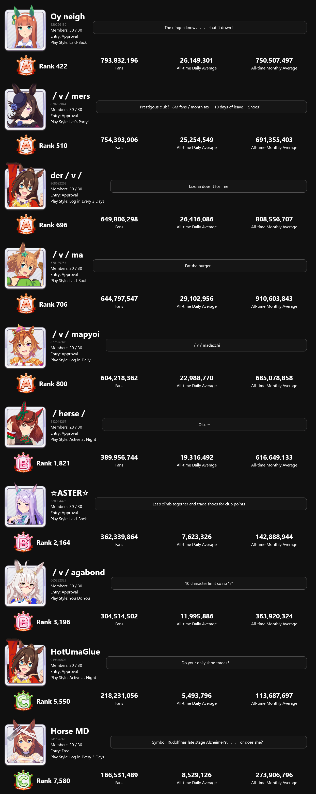 >>729356823Just checked the release schedule, and if I'm tallying the releases right then MANT doesn't seem out of the ordinary. Depending on how you count the anniversary umas, it might actually have MORE new umas than the scenarios immediately before/after it:>13 new umas during URA Finale, not counting the launch roster (TM Opera O, Mihono Bourbon, Biwa Hayahide, Curren Chan, Narita Taishin, Smart Falcon, Narita Brian, Seiun Sky, Hishi Amazon, Fuji Kiseki, Gold City, Meisho Doto, and Eishin Flash)>11 new umas during Unity Cup (Hishi Akebono, Agnes Digital, Kawakami Princess, Manhattan Cafe, Tosen Jordan, Mejiro Dober, Fine Motion, Tamamo Cross, Sakura Chiyono O, Mejiro Ardan, and Admire Vega)>Tannhauser and Kitasan on the 1st anniversary alongside MANT>11 new umas during MANT (Satono Diamond, Mejiro Bright, Nishino Flower, Yaeno Muteki, Ines Fujin, Mejiro Palmer, Inari One, Sweep Tosho, Air Shakur, Bamboo Memory, Copano Rickey)>9 new umas during Grand Live (Yukino Bijin, Seeking the Pearl, Yamanin Zephyr, Nakayama Festa, Wonder Acute, Zenno Rob Roy, Hokko Tarumae, Daitaku Helios, and Shinko Windy)>Turbo and Mr. C.B. on the 2nd anniversary alongside Grand MastersI could've sworn there was a 10th uma releasing during Grand Live, but when I went to double-check my numbers I only saw 9...
