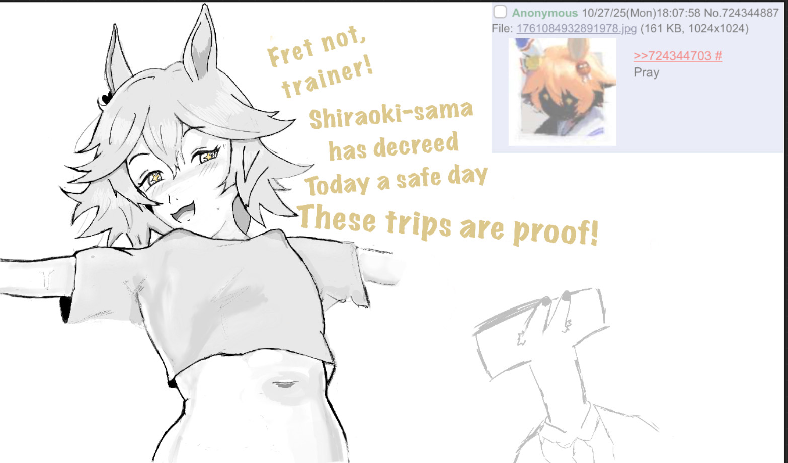 >>729357496>Divine HorseWITH THIS 7 SHIRAOKI-SAMA WILL GRUBBLE ME INTO REALITY!