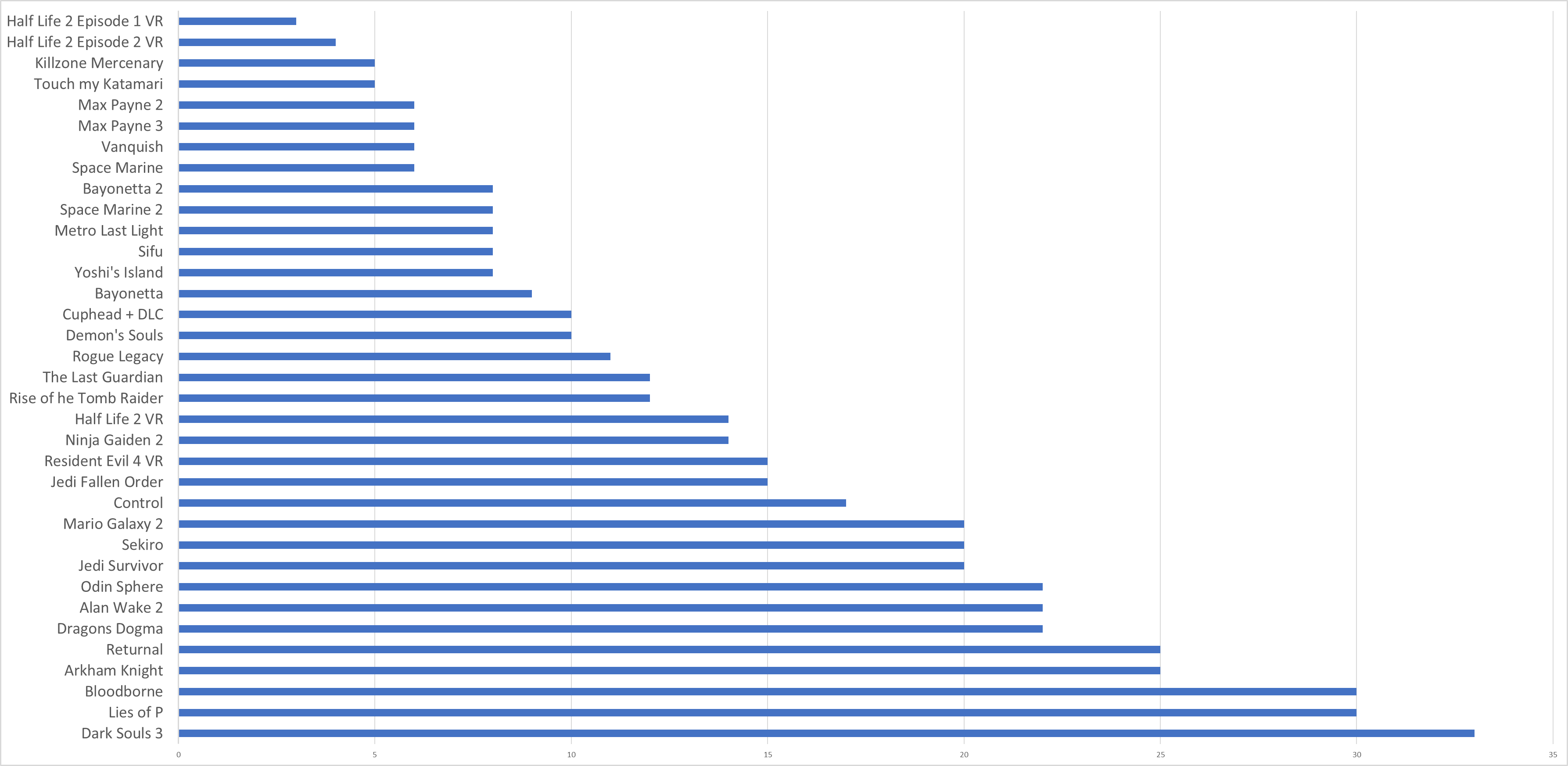 >>729353043From best to worst, roughly:BloodborneSekiroHalf Life 2 VRHalf Life 2 Episode 2 VRThe Last GuardianResident Evil 4 VRCuphead + DLCLies of PDemon's SoulsAlan Wake 2Half Life 2 Episode 1 VRBayonettaBayonetta 2Odin SphereYoshi's IslandNinja Gaiden 2ControlMario Galaxy 2ReturnalSifuDark Souls 3Jedi SurvivorArkham KnightSpace Marine 2Space MarineVanquishMax Payne 3Max Payne 2Metro Last LightRogue LegacyJedi Fallen OrderDragons DogmaRise of he Tomb RaiderTouch my KatamariKillzone MercenaryGrant total playtime 490 hours, just shy of 10 hours a week>>729353191You're supposed to write them down somewhere