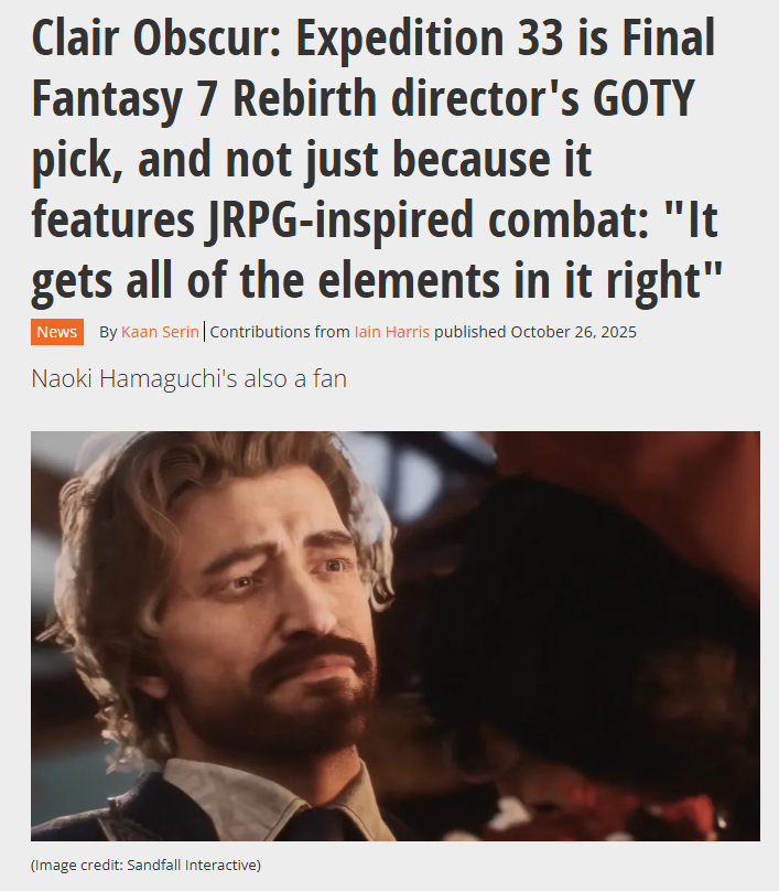 >Final Fantasy 7 Remake and Final Fantasy 7 Rebirth's director Naoki Hamaguchi is clearly a man of good taste if his own games are anything to go by, but if there was ever any doubt, he's also declared that Clair Obscur: Expedition 33 is his personal game of the year pick.