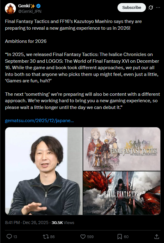 Vocal critic of turnbased games Yoshi-P puts Ghost of Yotei above Clair Obscur while calling dlc to FF14 the best game of the year