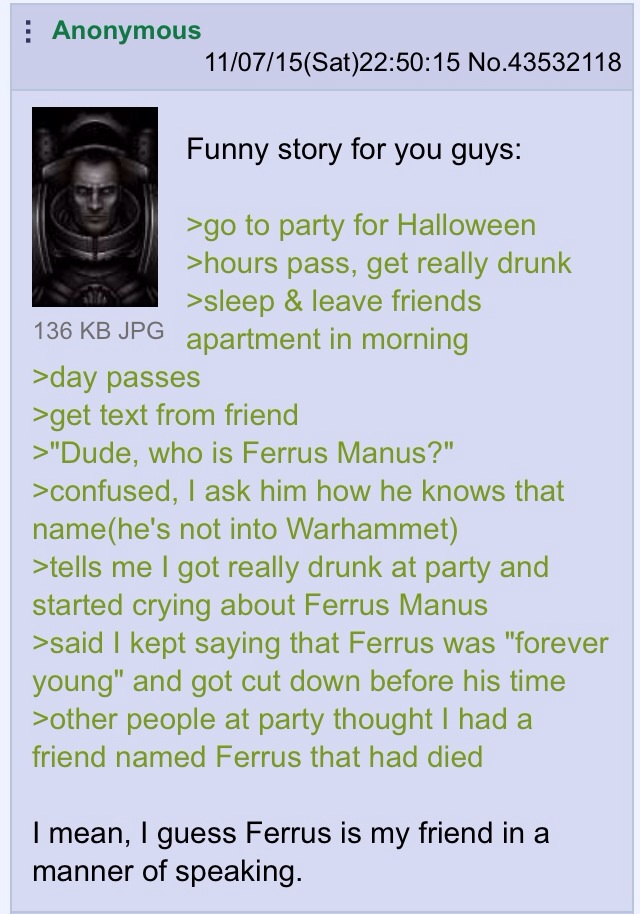 >>729395978First it was Imperial propaganda for their cannon fodder. Then it was retconned to a terminator. Then the novels made the guy an immortal who has been reincarnating since biblical times, and was best buds with the emperor at one point. He was part of a whole group of these immortal humans, one of them who shot MLK on behalf of an alien group. Did I mention the Horus Heresy novels are fucking retarded?