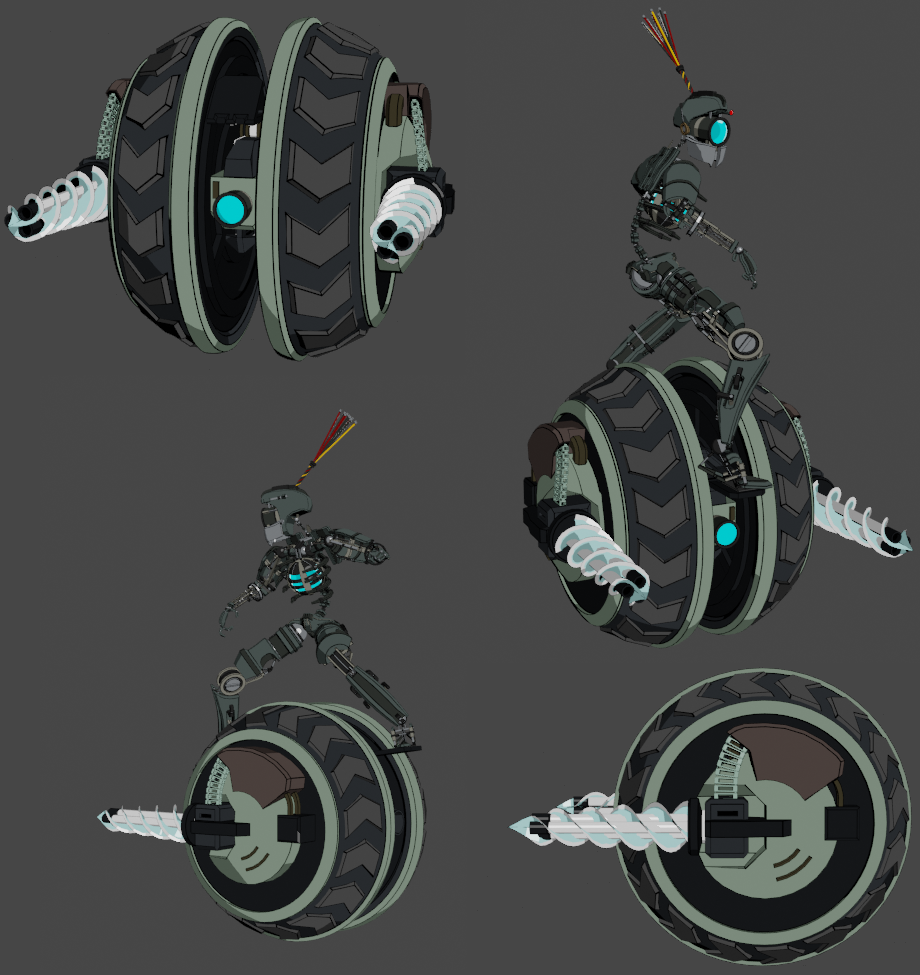 Second of the three non-humanoid enemy classes, the Rollout. Like the Launch, it can either fight on its own or serve as a mount/vehicle for a regular combatant. This one is more "motorcycle"-esque, where it's primarily designed to do contact damage rather than hitbox damage. Tentatively the drills allow it to burrow into walls/floors and re-emerge, though I'm not sure how much logic it would take to make that work (since it would involve either some sort of convoluted geometry tagging system, or else I'd need to do some check to validate that a surface is thick enough to obscure the model, and ensure that the new location to re-emerge is plausibly connected, which seems irritating).