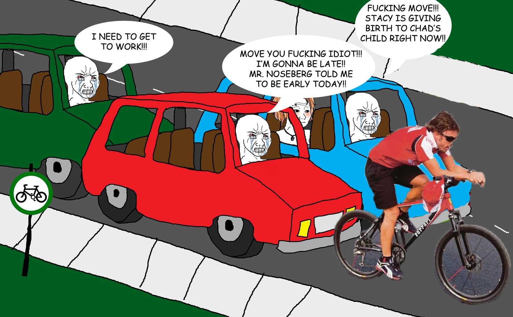I dont have problem with normal cyclistThe one that just a guy who wants to go from A to B I have problem however with thos spandex wearing fuck nuggets and their fucking aero helmets "TRAINING" in the fucking road