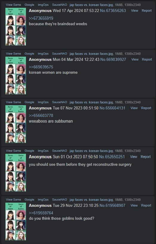 >>729435624South Korea is the cosmetic surgery capital of the world because not only are they ugly but they're incredibly unhappy about it. Japs are happy to look the way they are. I assure you, women who are obsessed with the way they look to the point that they'd go under the knife are not women you want to be around.