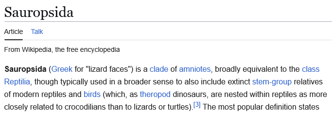 >>729476539>It's right there in plain English on the sauropsida article>birds are dinosaurs and lizardsThat is not there in plain english, at all. Lizards are their own separate subgroup.