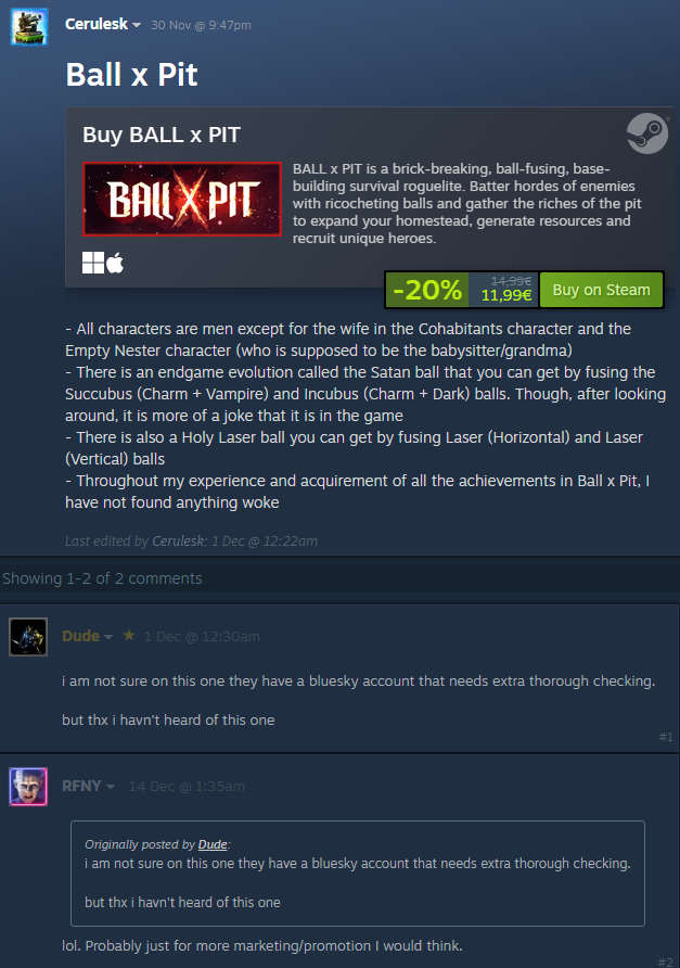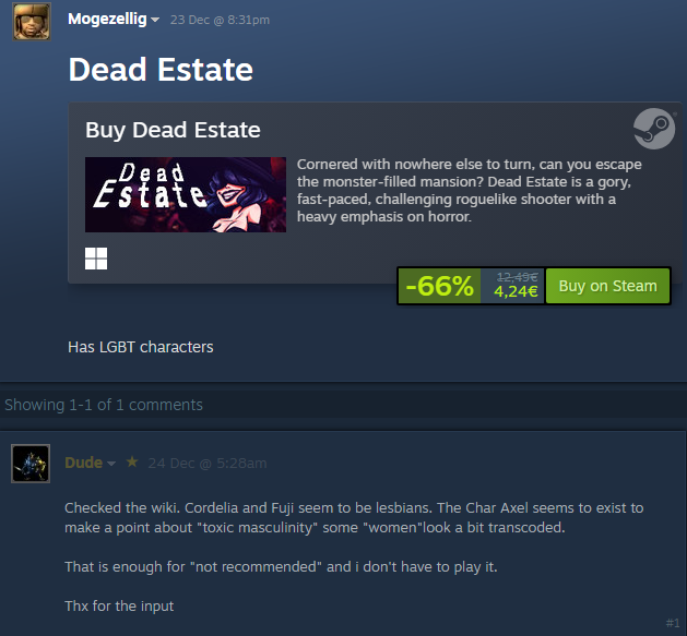 >>729494479>>729494514>>729494517>>729494573Joke's on you, I just wanted an excuse to post this.THE CHUDS ARE BACK IN TOWNTHE CHUDS ARE BACK IN TOWNhttps://store.steampowered.com/curator/45856364/What do we think of the successor to the funniest, most pathetic list of all time, lads?