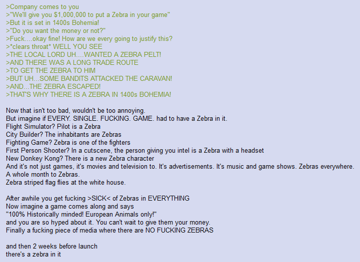 >>729495884Because it's dull as fuck. Not one character I wound up giving a shit about in the first game. Didn't even bother with the sequel. If I wanted to wander around aimlessly pretending it's literally 1316AD I'd go to a LARP festival