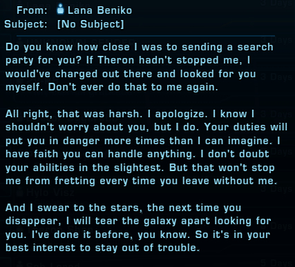 >>729607721I love Lana so much it's unreal. Haven't played SWTOR but I still remember her, not a single other game I've played since then has had female companion as compelling