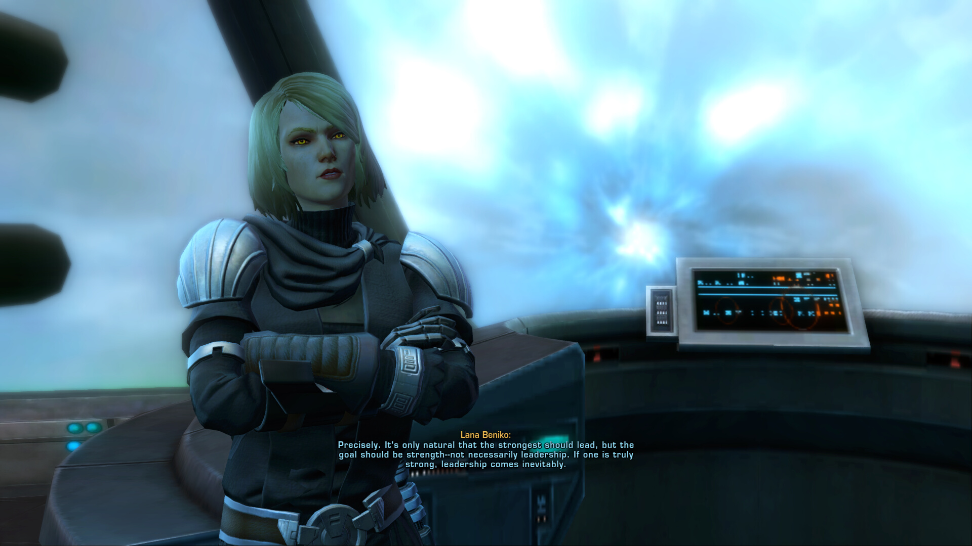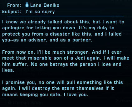 SWTOR, for all its faults, introduces the most complex portrayal of the Sith as a philosophy and a society. Sure, you have your Palpatines, Vaders, and outright retards. Then you have the noble demons you can play as or meet. Teaming up with a Jedi to kill a rival Sith Lord that is a greater threat to the Republic too and the guy wishing the Jedi and Sith could meet more like that instead of enemies. Lana is probably the most normal and level-headed Sith who manages to be a charming person despite the whole using people as pawns thing