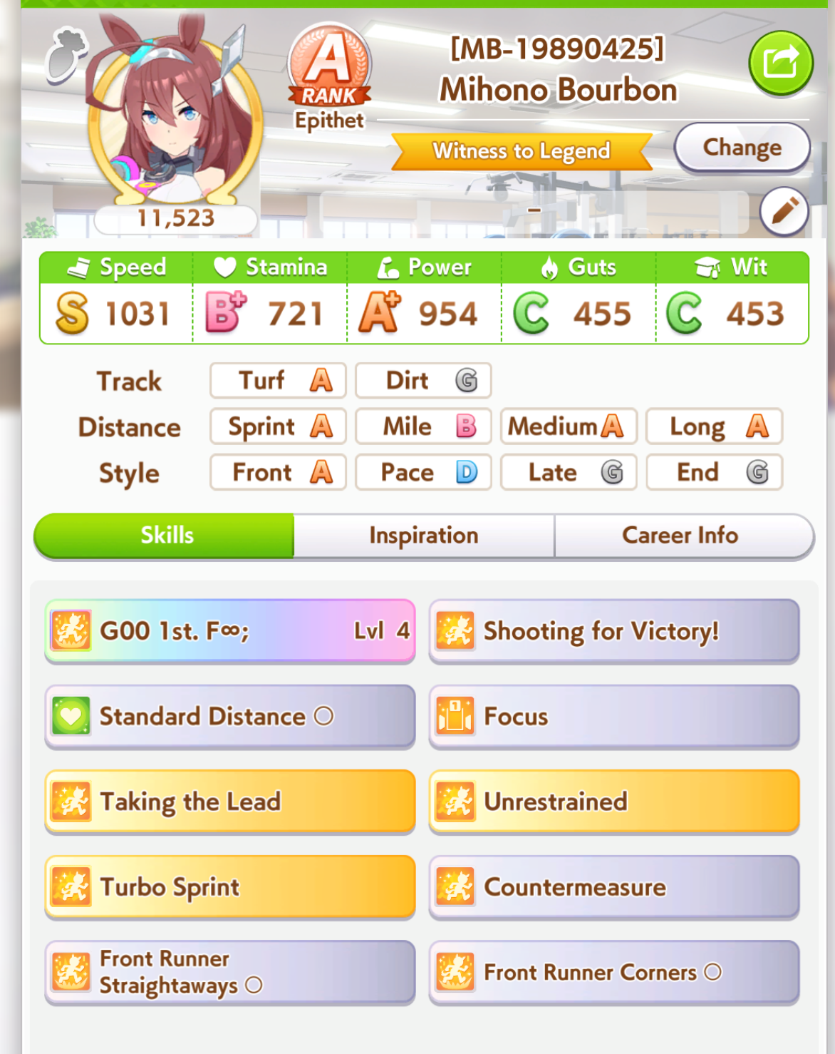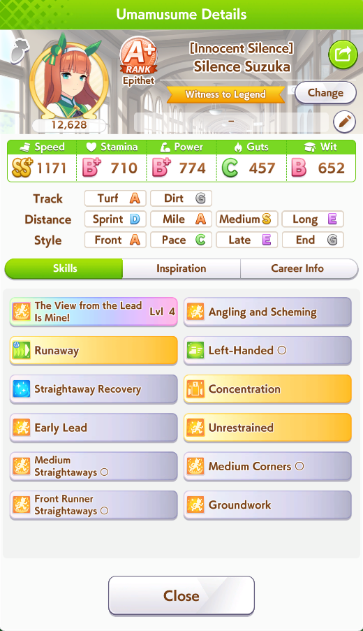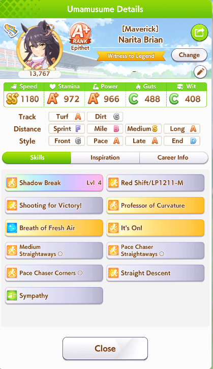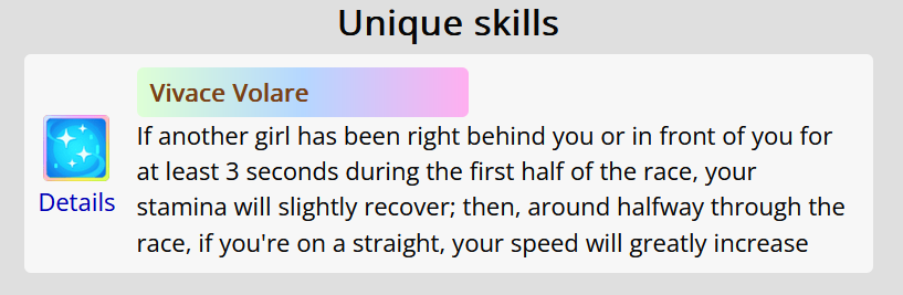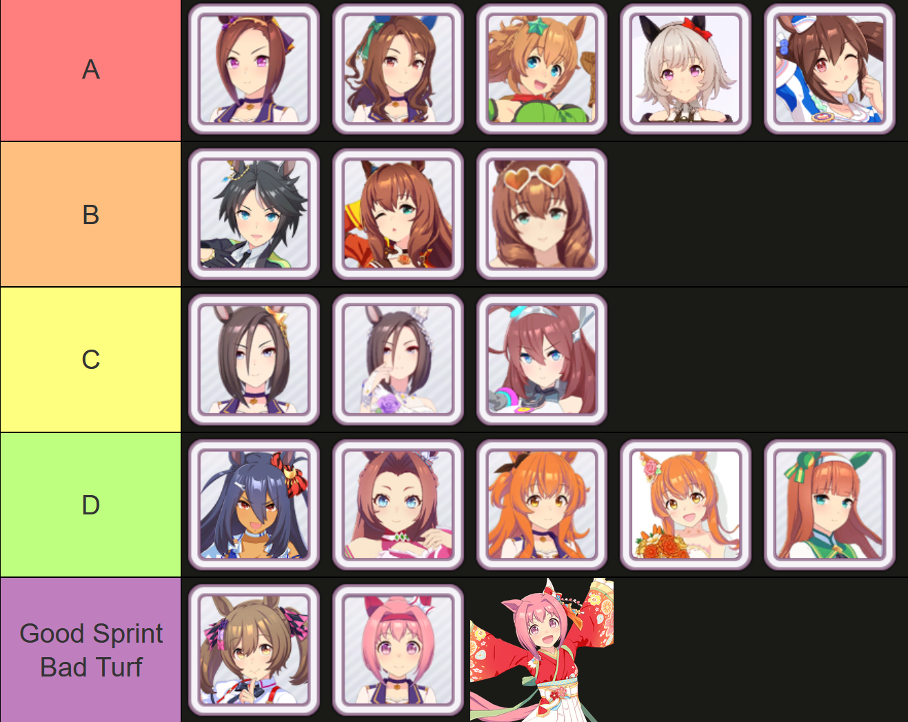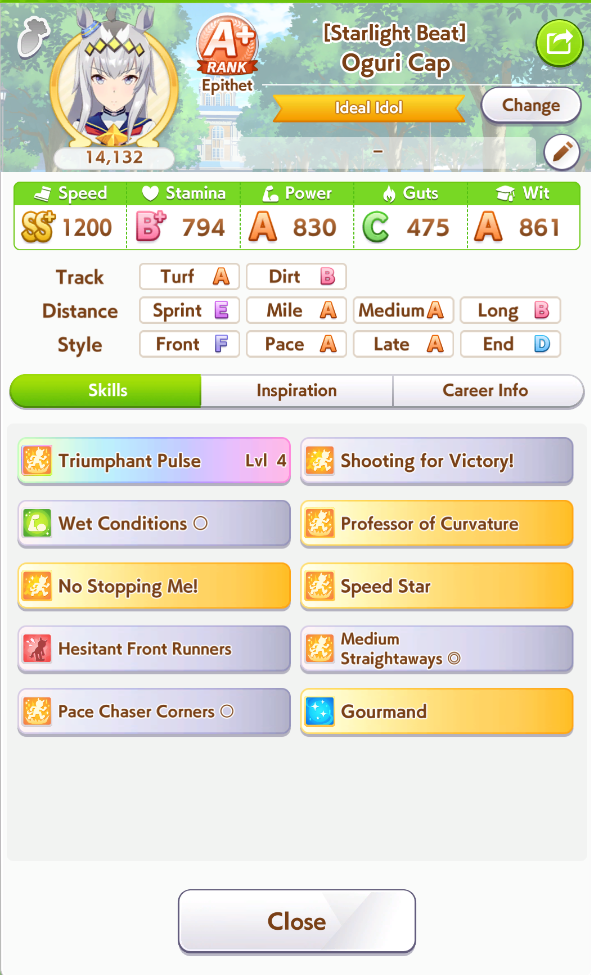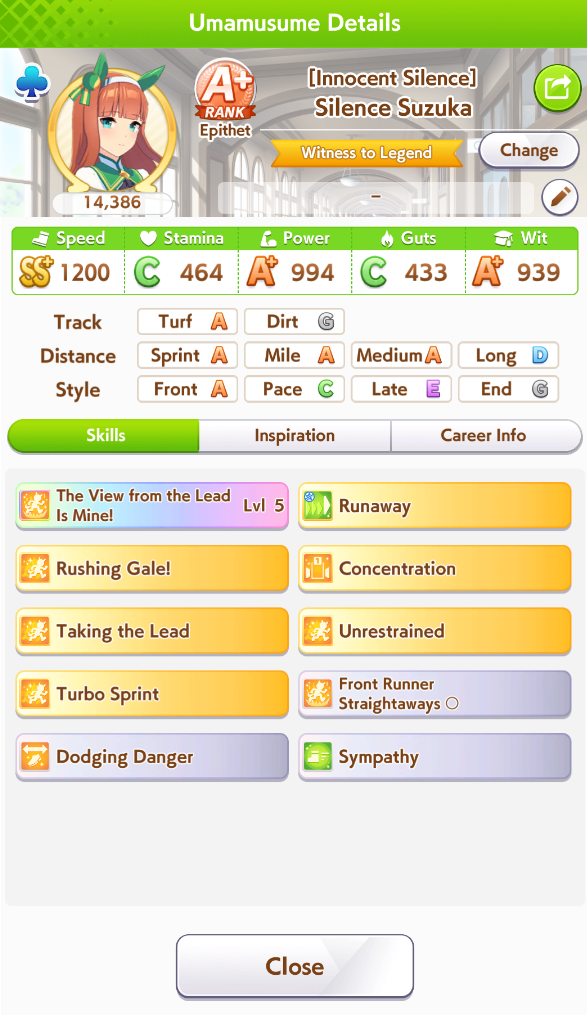 >>729606358Her unique is basically Falcon's but it procs from 4th to 1st place (good!) at any point of the middle leg (bad!). Aside from that, she has groundwork, Concentration and front savvy.Outside of being easy to build, she looks like a Suzuka sidegrade for the lazy or those who are just starting to use front runners.