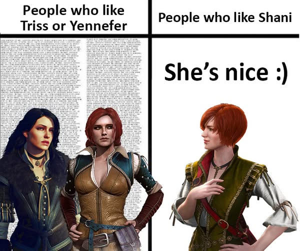 i never read the books and got hard filtered by witcher 1s control scheme. So I knew Triss from 2, and I knew she put out because of that. I'm a simple minded man.