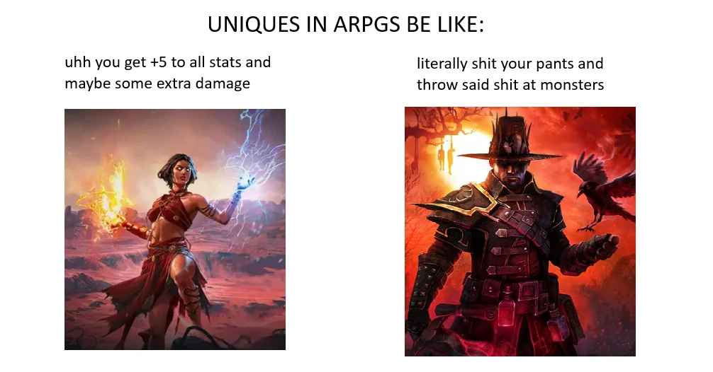 >>729650427Yeah its funny that their notional insistence backfires so badly.Grim dawn has really good class fantasy. Between the dual classing, damage conversion, and just general absolute maddening number of MIs, epics, and legendaries, you can make an end game viable build out of any "class fantasy".Hope they buff salazar's sword though, I just tried to make a build that focused on that because it looks cool and holy shit that summon is complete and utter ass