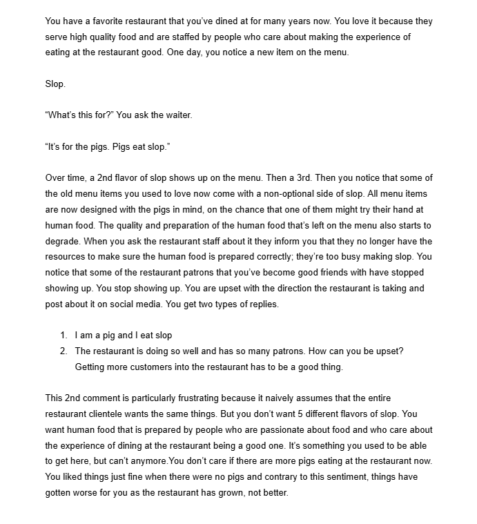 >>729680132The problem with an analogy like this is that the moment 'slop' shows up is different for many different types of people in regards to MTG