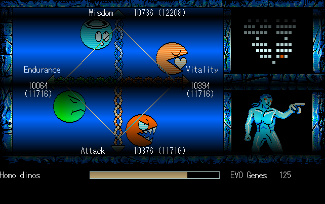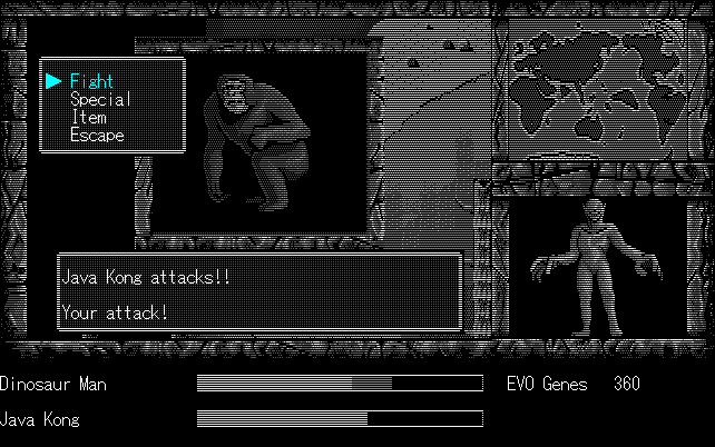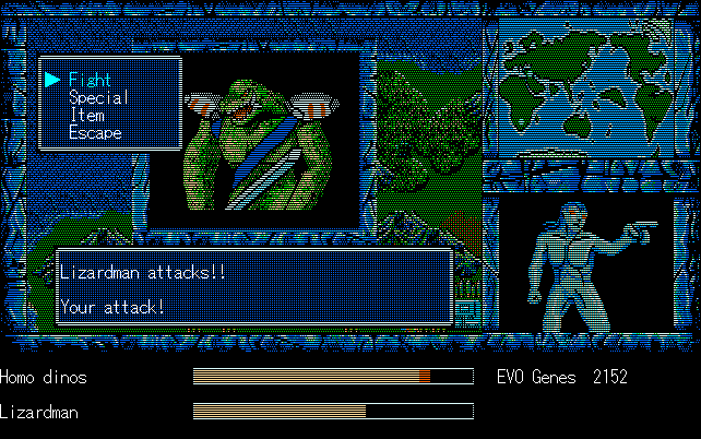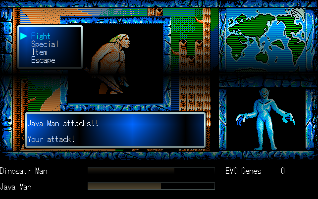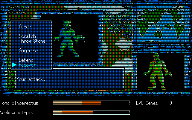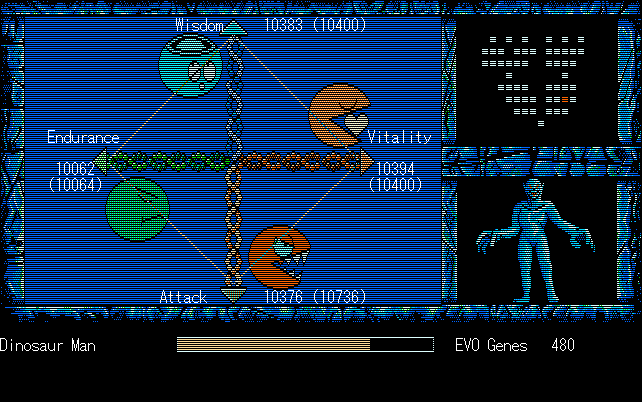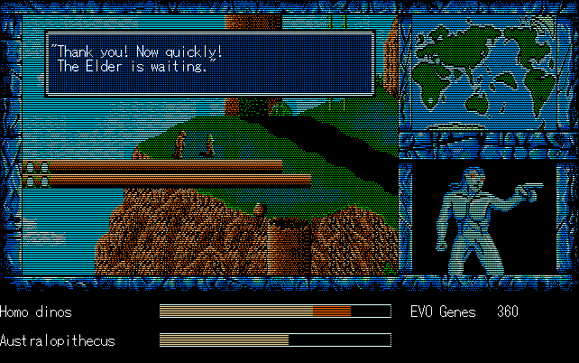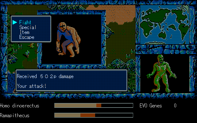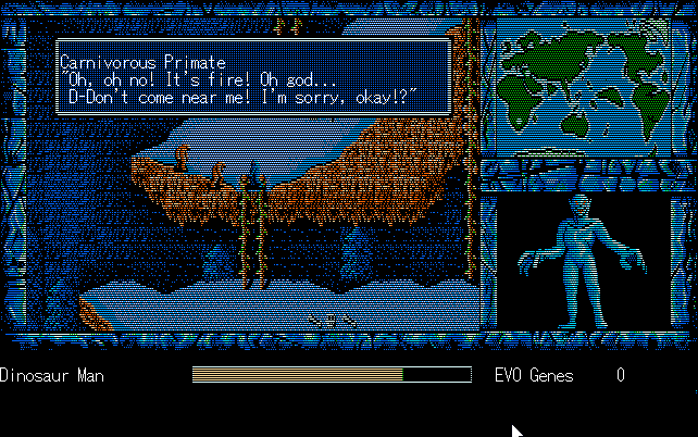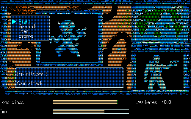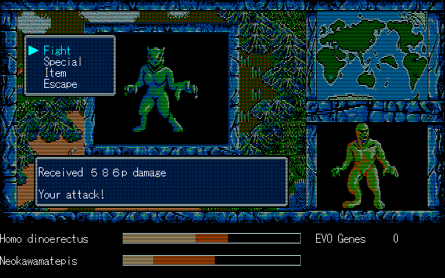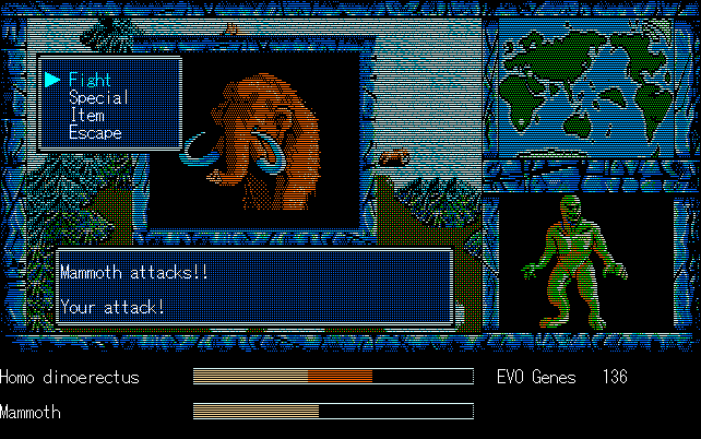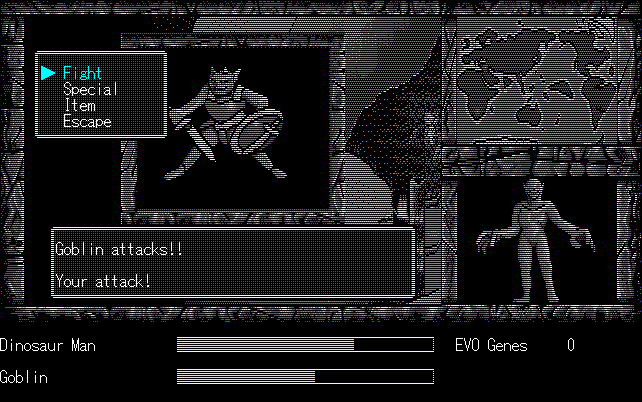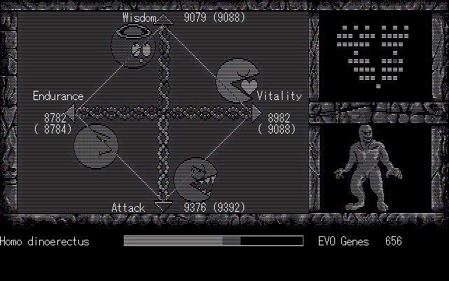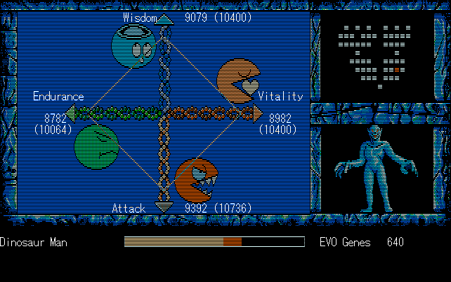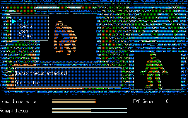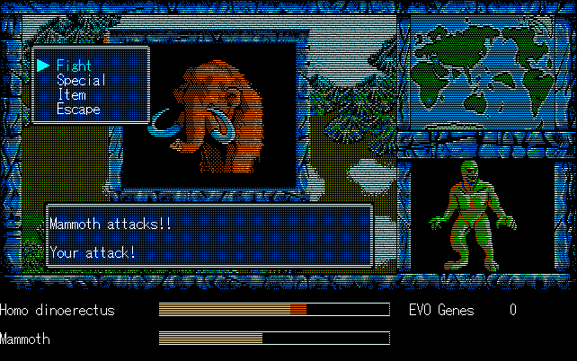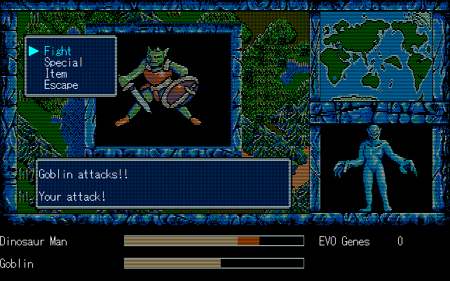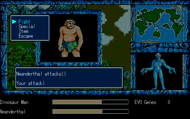 We're back to knock another shitty Twitter thread off the board, it's time to play "4.6 Billion Year Story: The Theory of Evolution".Previous thread: >>729623224>What is this game?The original JRPG predecessor of E.V.O. Search For Eden for the SNES, released on the PC-98, developed by Almanic and published by the JRPG gods themselves Enix. The game follows the perspective of a mortal creature chosen by Gaia, (You), to shepherd Earth through the entirety of its evolutionary history over the course of billions of years. You must save innocent wildlife from danger and clear obstacles to the world's continued evolution, while at the same time thwarting the machinations of a sadistic alien ojou-sama from outer space.>can I play it too?Just look up the ROM on MyAbandonware, then download the patch (along with the translated manual full of lore) here: https://46okumen.com/projects/e-v-o-the-theory-of-evolution/We're not wasting any time tonight, it's time for another training arc. We're locked out of a part of the map because the lizard men there are too strong. In order to hunt monsters that are one step higher than us on the evo ladder, we need to take advantage of our new stat cap and raise everything to max.