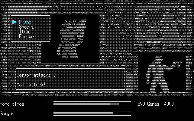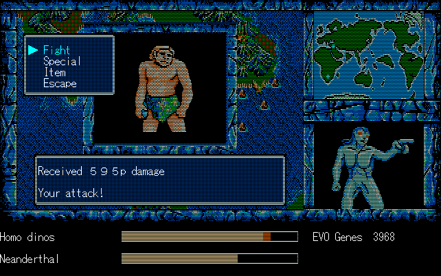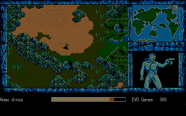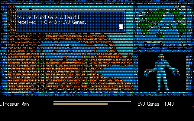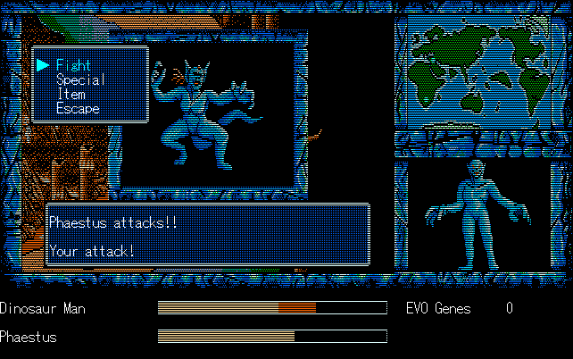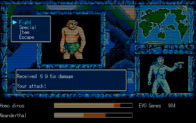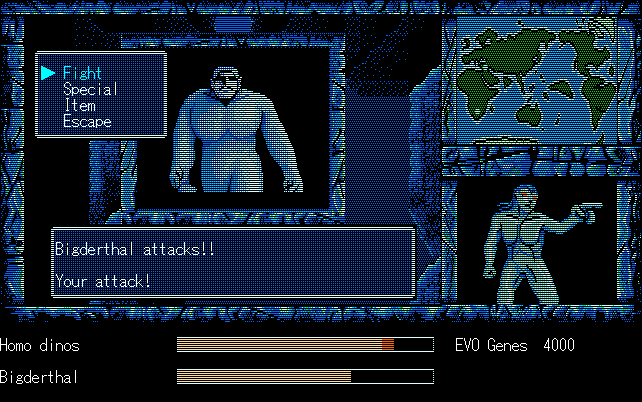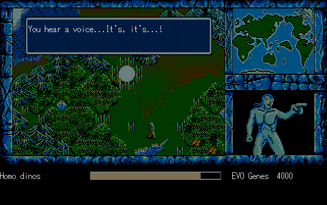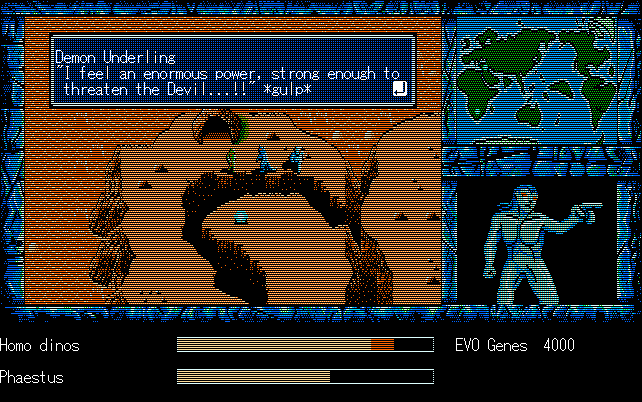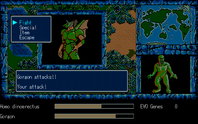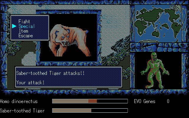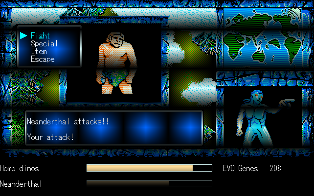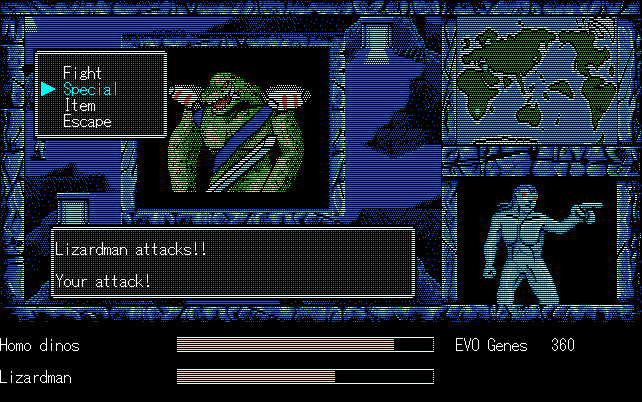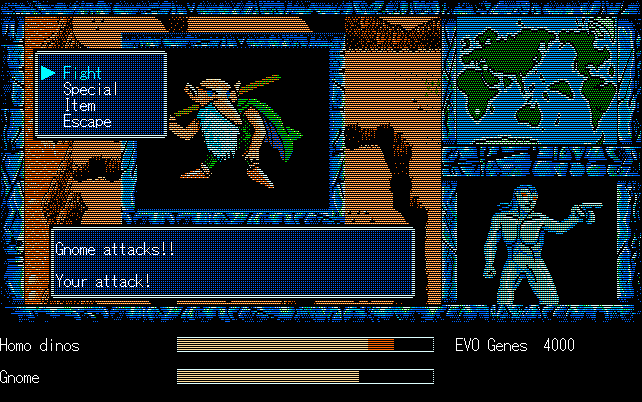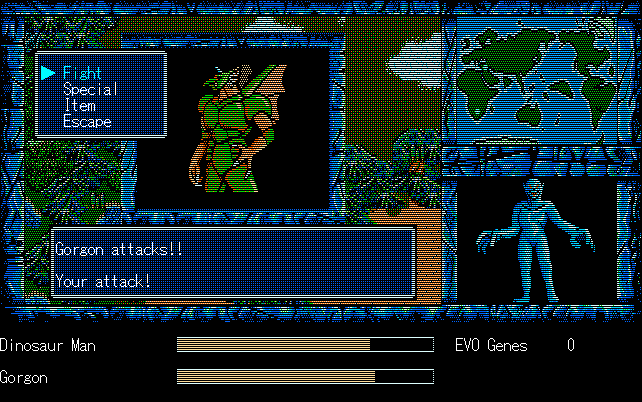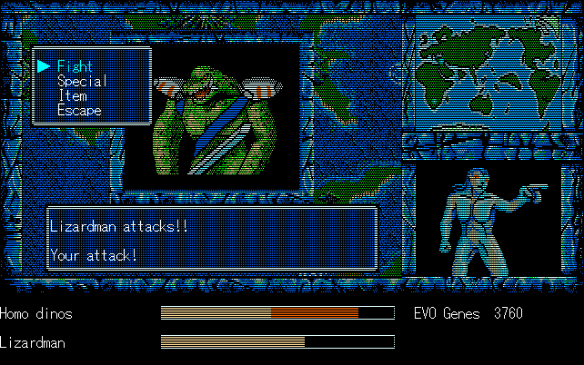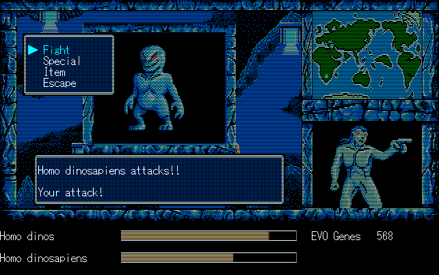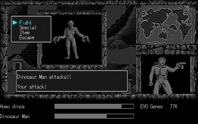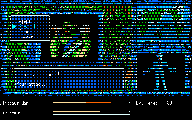 We're back to knock another shitty Twitter thread off the board, it's time to play "4.6 Billion Year Story: The Theory of Evolution".Previous thread: >>729623224>What is this game?The original JRPG predecessor of E.V.O. Search For Eden for the SNES, released on the PC-98, developed by Almanic and published by the JRPG gods themselves Enix. The game follows the perspective of a mortal creature chosen by Gaia, (You), to shepherd Earth through the entirety of its evolutionary history over the course of billions of years. You must save innocent wildlife from danger and clear obstacles to the world's continued evolution, while at the same time thwarting the machinations of a sadistic alien ojou-sama from outer space.>can I play it too?Just look up the ROM on MyAbandonware, then download the patch (along with the translated manual full of lore) here: https://46okumen.com/projects/e-v-o-the-theory-of-evolution/We're not wasting any time tonight, it's time for another training arc. We're locked out of a part of the map because the lizard men there are too strong. In order to hunt monsters that are one step higher than us on the evo ladder, we need to take advantage of our new stat cap and raise everything to max.