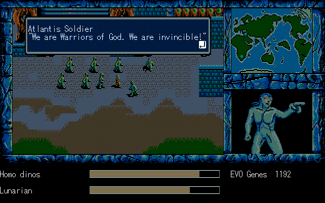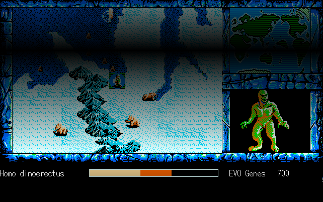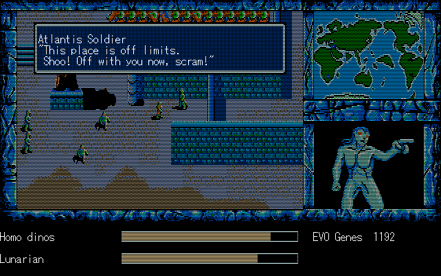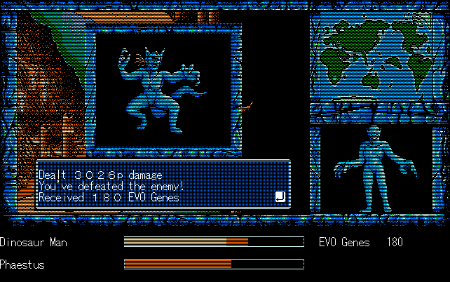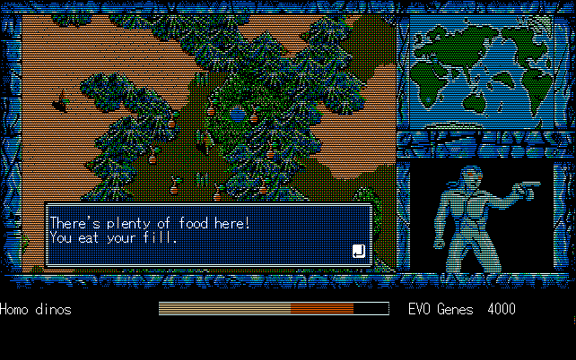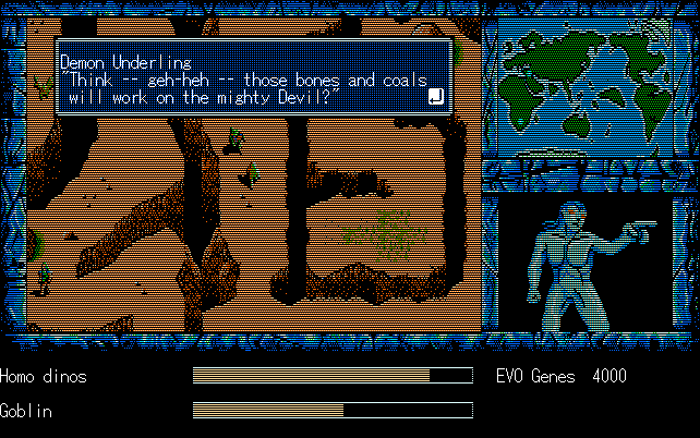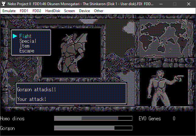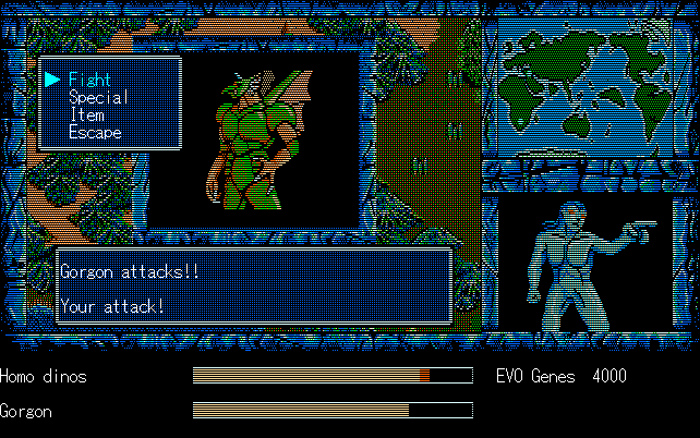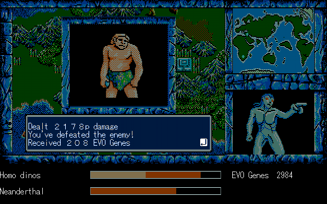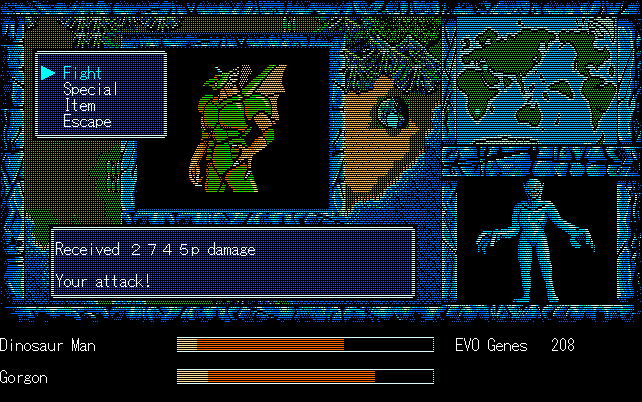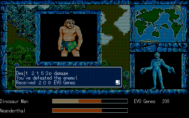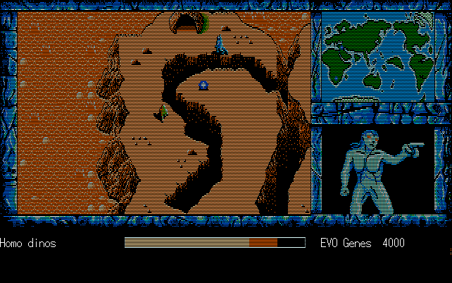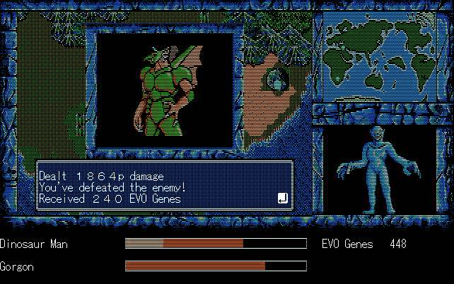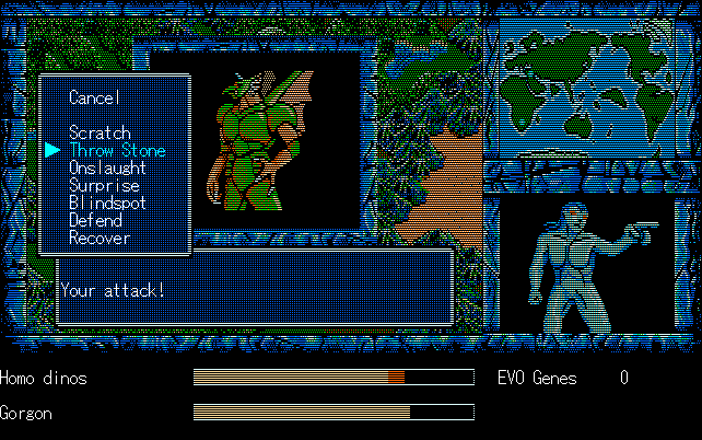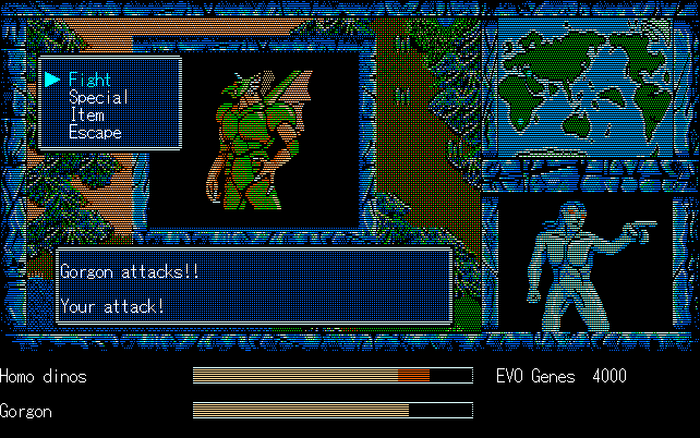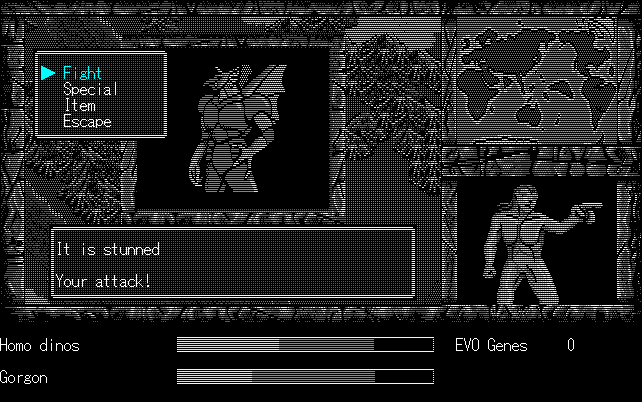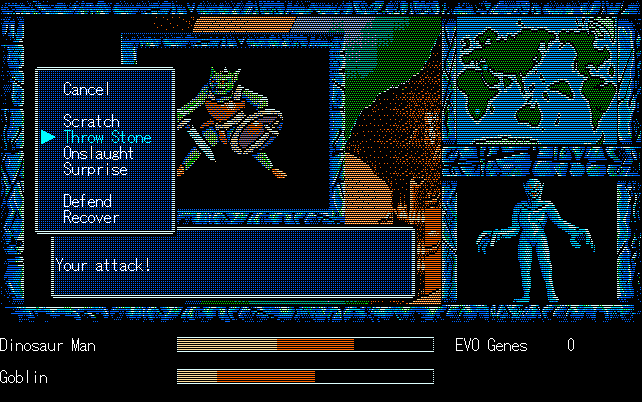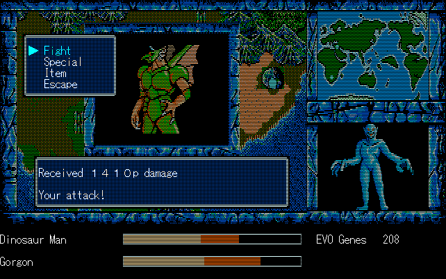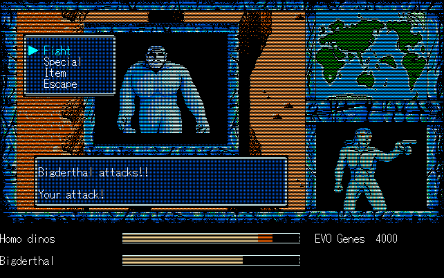 We're back to knock another shitty Twitter thread off the board, it's time to play "4.6 Billion Year Story: The Theory of Evolution".Previous thread: >>729623224>What is this game?The original JRPG predecessor of E.V.O. Search For Eden for the SNES, released on the PC-98, developed by Almanic and published by the JRPG gods themselves Enix. The game follows the perspective of a mortal creature chosen by Gaia, (You), to shepherd Earth through the entirety of its evolutionary history over the course of billions of years. You must save innocent wildlife from danger and clear obstacles to the world's continued evolution, while at the same time thwarting the machinations of a sadistic alien ojou-sama from outer space.>can I play it too?Just look up the ROM on MyAbandonware, then download the patch (along with the translated manual full of lore) here: https://46okumen.com/projects/e-v-o-the-theory-of-evolution/We're not wasting any time tonight, it's time for another training arc. We're locked out of a part of the map because the lizard men there are too strong. In order to hunt monsters that are one step higher than us on the evo ladder, we need to take advantage of our new stat cap and raise everything to max.
