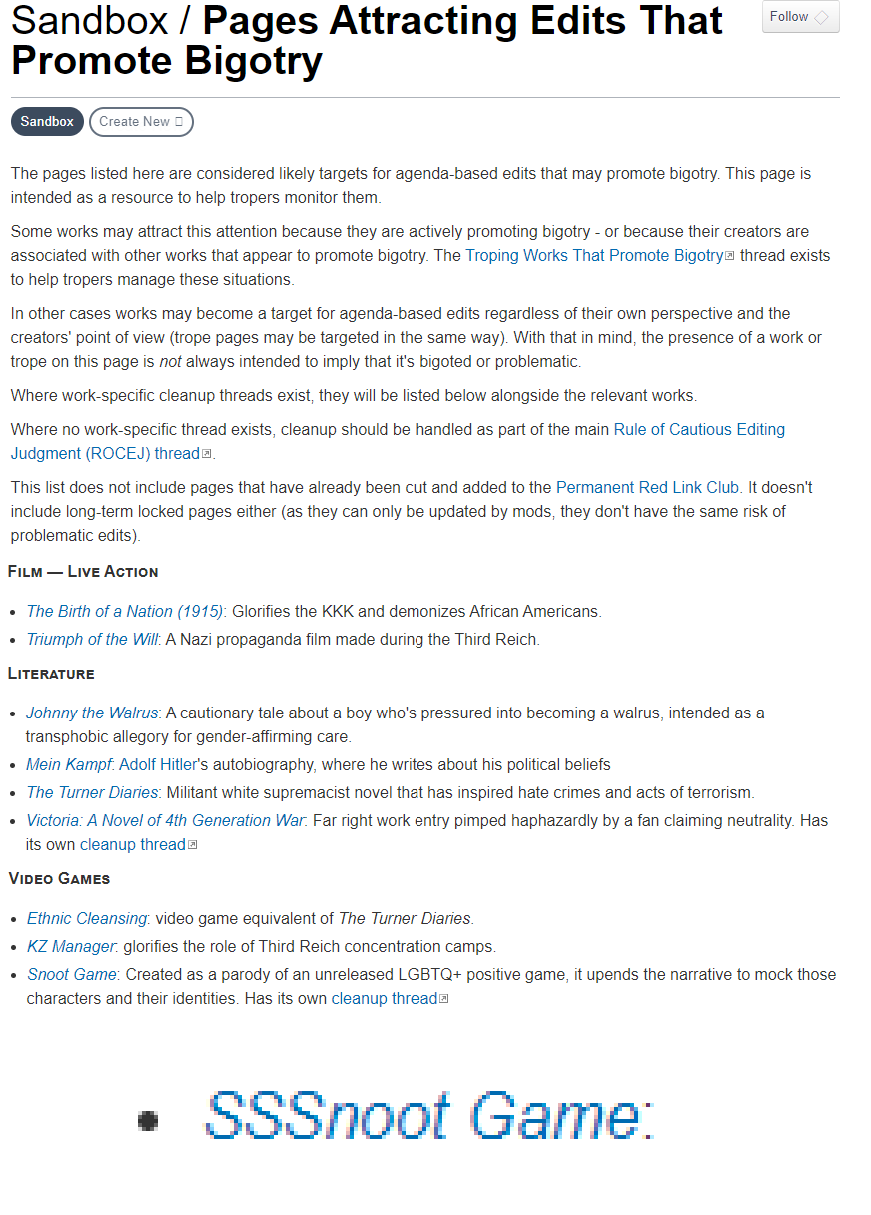 >>729718794I just found out that the tvtropes page for Snoot Game got deleted. Guess those fuckers who compared the game to Mein Kampf won.