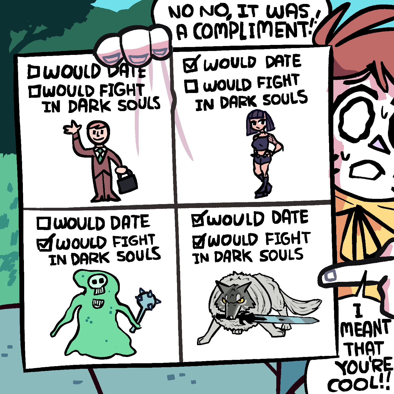 >>729726598Today i will remind them>Her: "oh...OH MY GOD... ARE YOU THE BIKE KEK GUY???">Me: "Y-yeah...">Her: "HAHAHAHAHAHAHAHAHAHAHAHAHAHAHA!!!!!">Her: "WAIT, HOLD ON, I GOTTA SHOW MY FRIENDS THIS.">She asked the people at the table behind us if she could borrow one of their phones for a second to pull up something on the browser. Then she held their phone somewhat in front of hers and took a photo of me along with it.>I never asked for the photo so here is my approximate recreation of what I think it looked like: *pic related*>She was busy texting seemingly all of her friends as we finished our meals and stood up, when I decided to pipe up again.>Me: "Um, y-you know wh-what would make the happiness in the world increase...">She looked up from her phone with a sly smile.>Her: "What?">Me: "I-if...if we k-- um, kissed...">Her amused smile slowly descended into an absolutely indiscernible neutral expression.>then, after a pause>it rose again into a smile>Her: "You... are so cute. Close your eyes. I have a surprise for you.">I closed my eyes tight, and gently puckered my lips, bracing for a kiss.>Then she slapped my ass so hard that there is still a palm print on it.https://www.tumblr.com/shencomix/771982490562871296/i-went-on-a-date-today-and-she-found-out-i-made