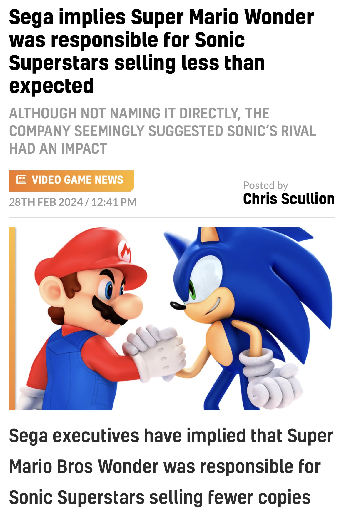 >>729764370>Sega implies Super Mario Wonder was responsible for Sonic Superstars selling less than expectedSuperstars sold like shit because the game was shit, mario wonder had nothing to do with it