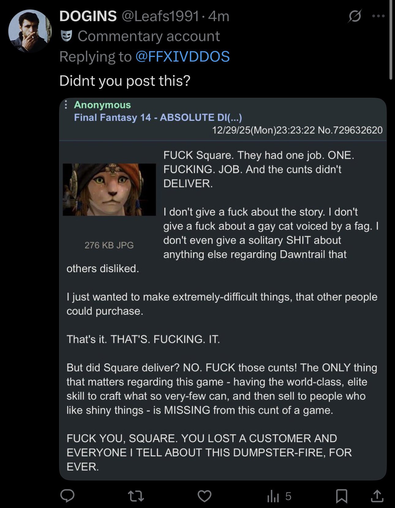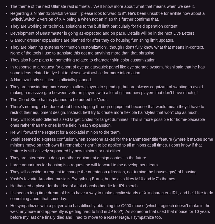 >>729749079>>729749286He probably feels obligated to say that since whatshisnuts wrote it special for him. Still retarded.>>729749284Doesn't matter which one it is, XIV being hamstrung by making it playable on consoles has been a constant issue since launch.