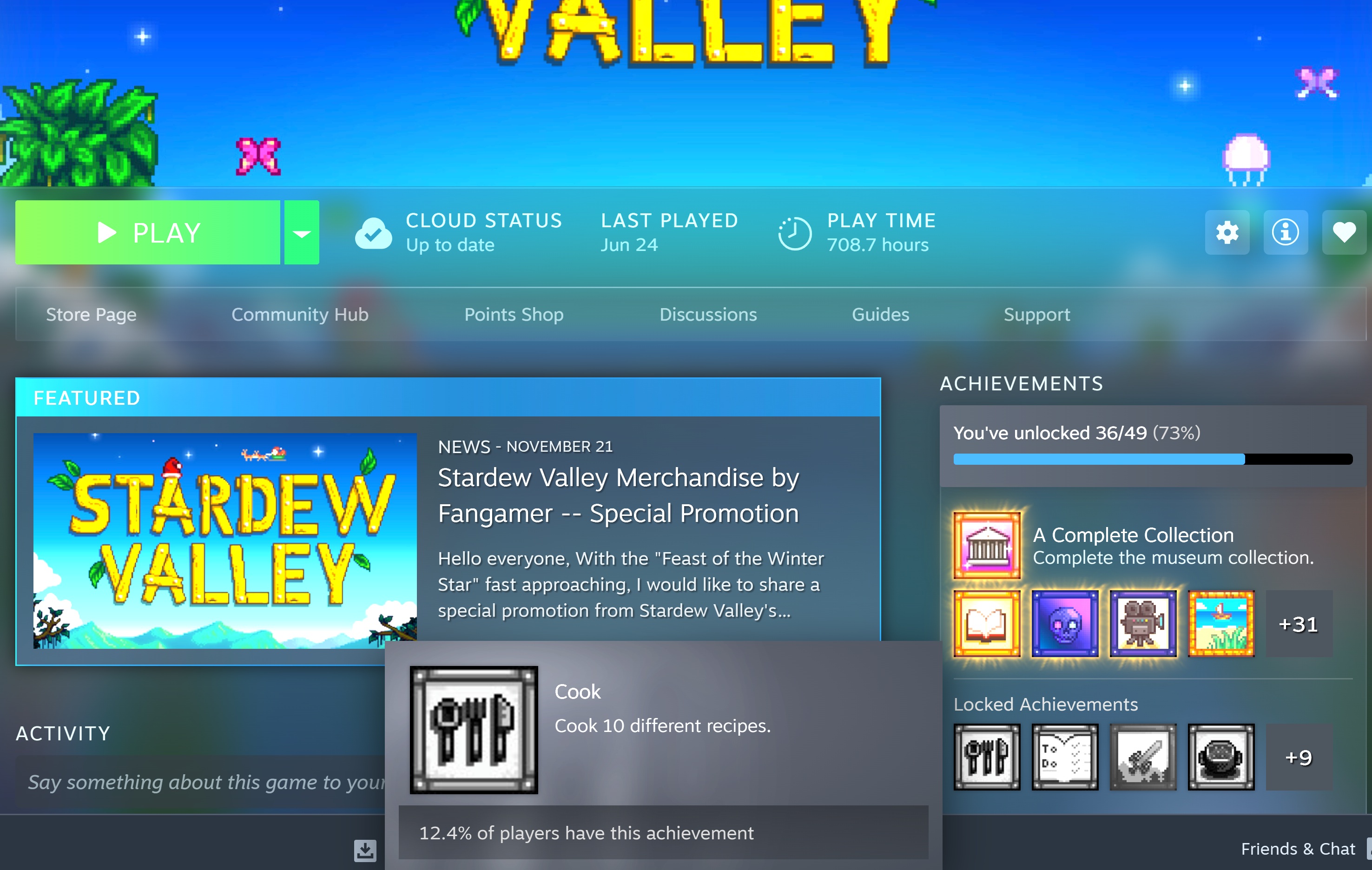 i played stardew for the first time this past summer. i had a ton of fun with it, think i sunk 800 hours over maybe 2 months. did one playthrough vanilla then did a modded playthrough. even got all the achievements. in some ways im glad i waited 10 years to play it, but looking back at older releases i was surprised to find how much of the game was available on launch. im looking forward to a new playthrough again maybe sometime next year. okay thanks for reading bye bye!