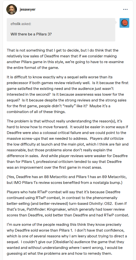>>729790368Josh Sawyer will forever live in the shadow of DOS2's phenomenal success. Literally, he supervised a turn-based mode patch for Pillars 1 just a few months back. He keeps thinking about Divinity and Larian all day every day.
