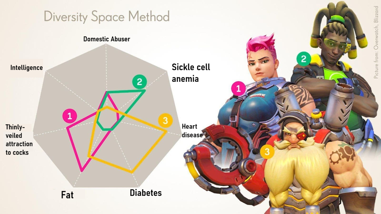 >>729858219Gender Identity scoring in this case would likely be:>male: 0>female: 5>non-binary: 10Regardless of what the theme of the category is, when there's only three levels it can be whilst other fields have more than three options, it looks dumb on a graph like this as it means a fat old gay albino Mongolian with three prosthetic limbs who maxes out every other field will still have this giant wedge of 0 on one side dragging his final score down, whilst someone like Mercy would be a 0 in every field but still have a huge spike because she's a female character in a game where the female characters outnumber the men.It is also kind of funny that Blizzard present the graph like this, but their most shilled characters in marketing like Mercy, Kiriko, D.Va, Juno and Sombra would all just be the same "0, 0, 0, 0, 0, Female spike" shape on here, with Tracer being the lone exception of the usually marketed girls by having a small spike in the sexual orientation section.