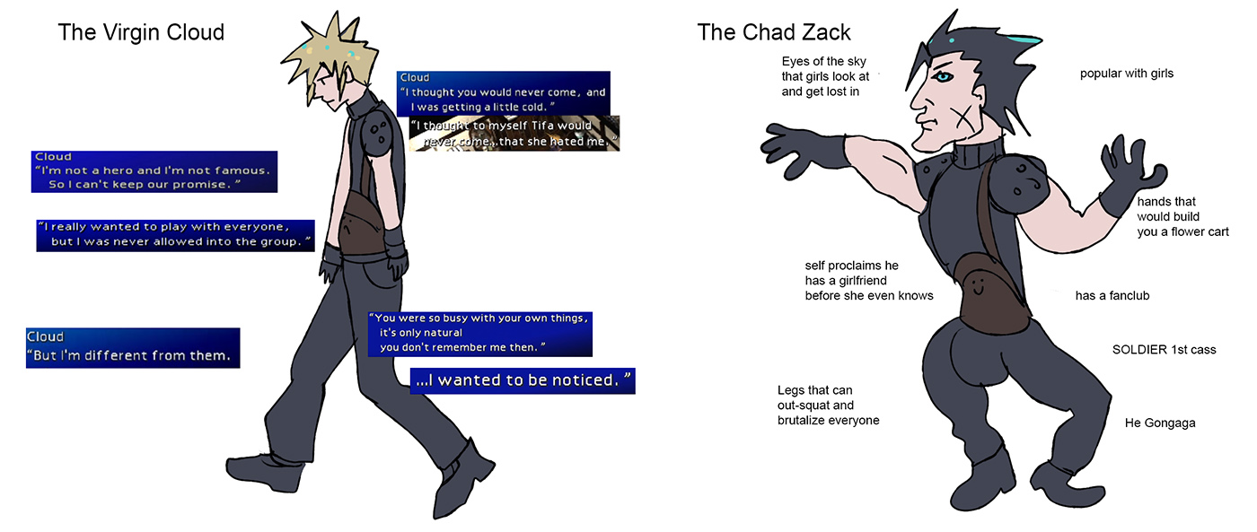 >>729890974Cloud never made it into SOLDIER. Time Jannies even show up out of nowhere and prevents Hojo from spelling it out loud during Remake, because this LARP has serious plot implications in FFVII.He was submitted to lab experiments which exposed him to Jenova cells like some Soldiers were and effectively was strong as one in the end.During the first visit to the Crater events in OG he even asks Hojo what was his number and the answer was he had none since he was counted as a failure, and ironically his (Hojo’s) failure was the one to succeed at the Reunion.
