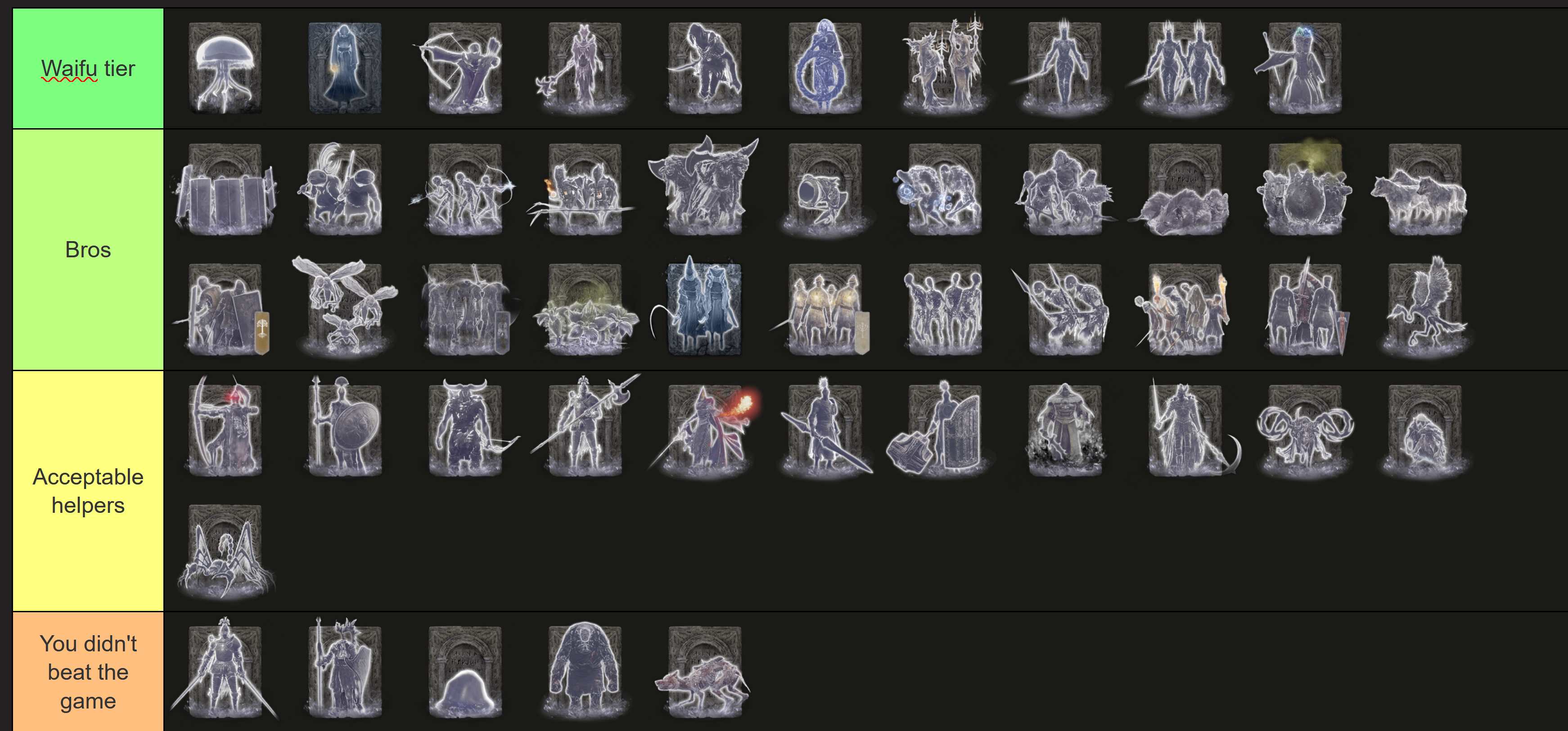 >>729900658Genuine question, no bullshitwhat do you think about using spirit ashes, but limiting character level to 75 or something, weapon upgrades to +16 / (+6 for boss weapons), and only using talismans up to +1 versions.So instead of full levelling, weapon upgrades, and talismans, you take some of that power and summon a spirit ash insteadsry if that sounds confusing, just had the thought rn
