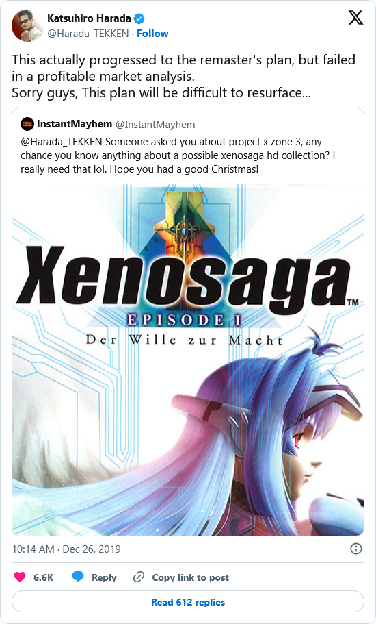 >>729915068>I think I even remember Bandai saying its impossible for them to port or remaster the series and would need to be remade it from scratchThey didn't say that, they just said it failed marketing team tests (i.e., they don't think it would sell enough to justify itself). This was during what was pretty much the height of interest in a port/remaster as well, after Xenoblade 2 reintroduced KOS-MOS and the Zohar to a new generation. I think it's safe to assume they're never going to do it.