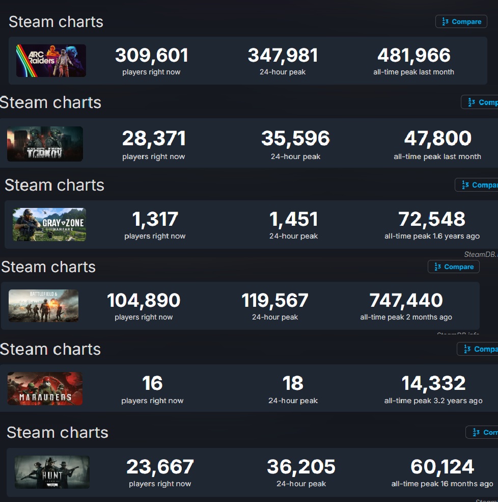 >Arc raiders still can't get even half of Counter Strike players daily>BF6 managed to get 75%lmao. Arc Raiders in a few months when it is dead like Tarkov, Tust, DayZ, etc.