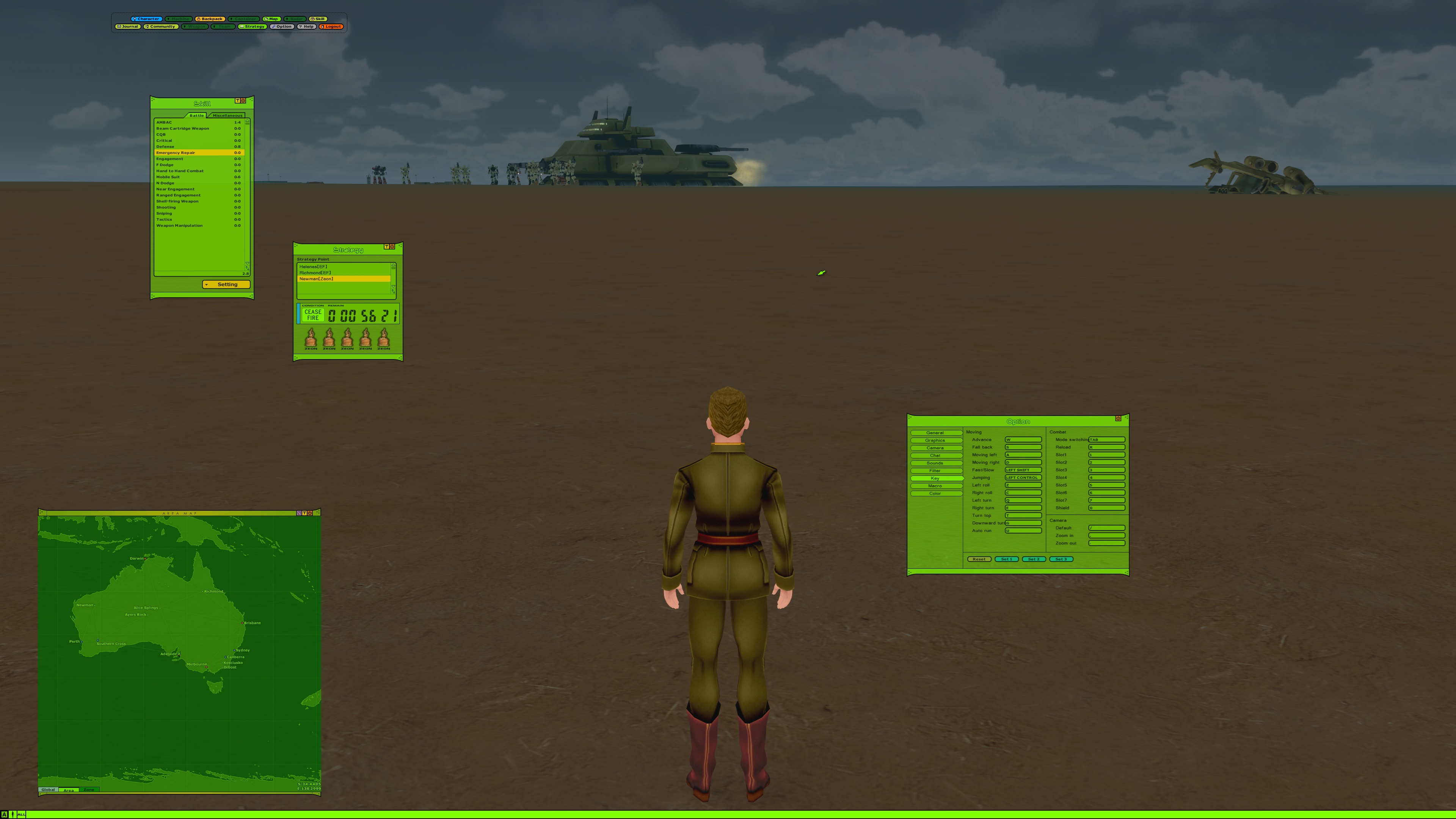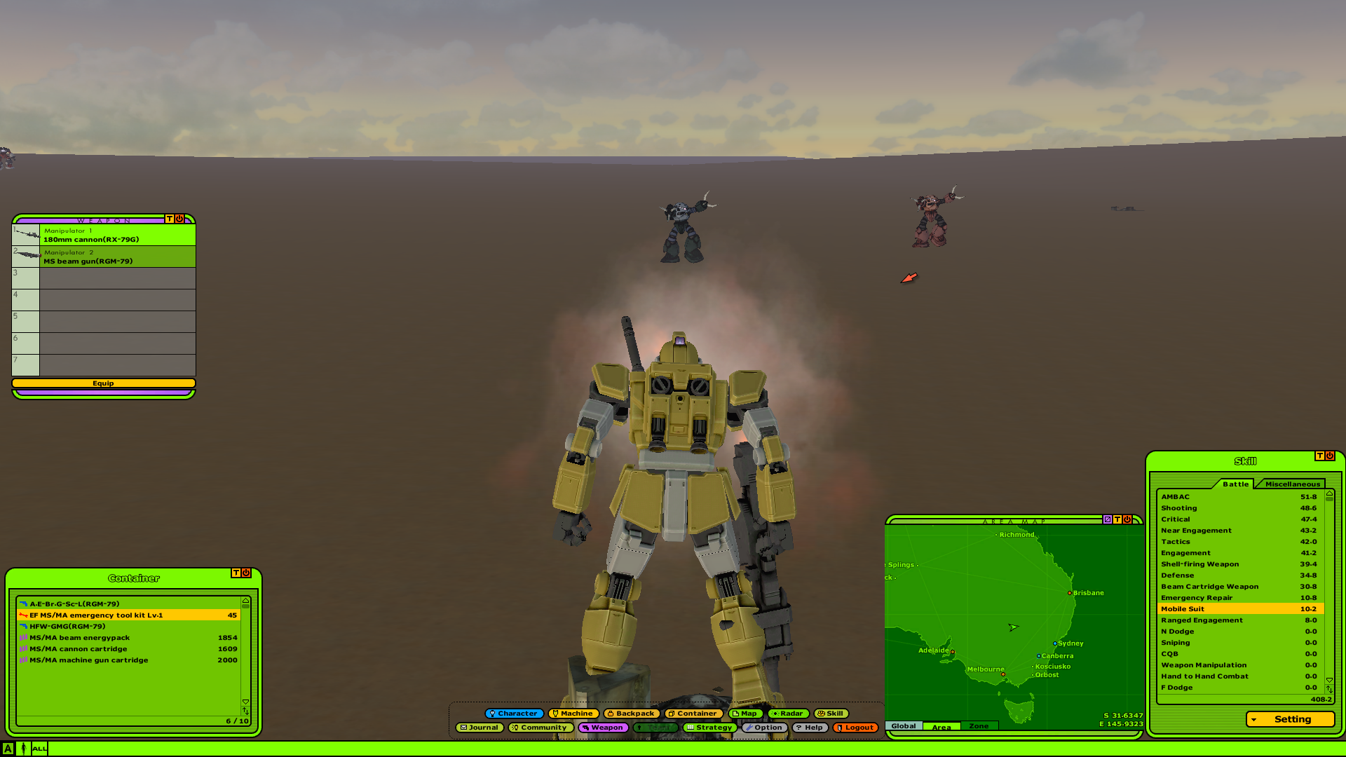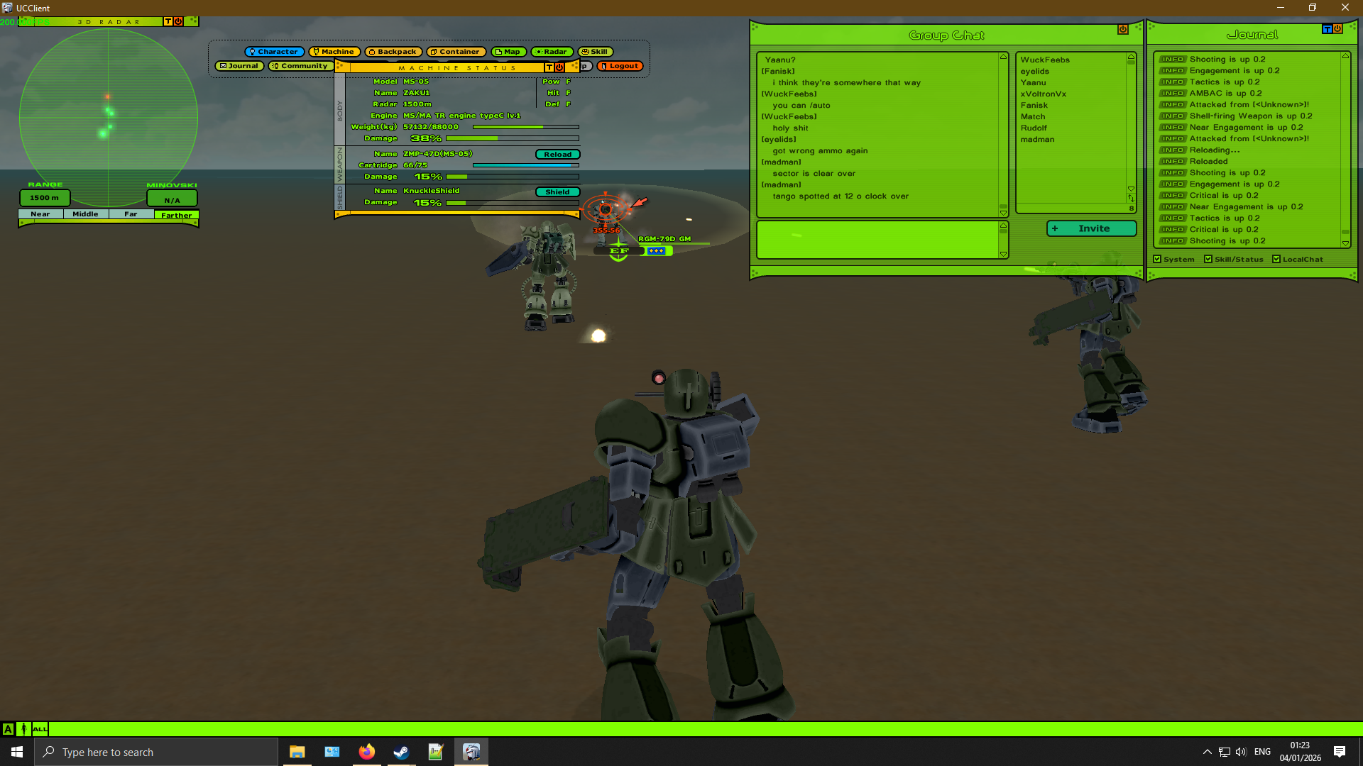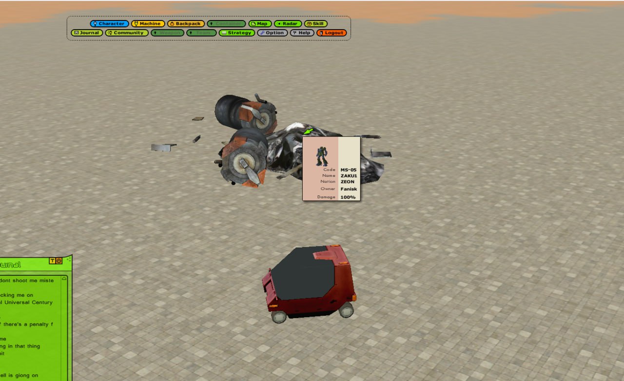 4chan's Bizarre MMOdventure is going to play Universal Century Gundam Online for the next two weeks. Come join in if you'd like.>What is it?An Ultima-like faction PvP MMO set in the Gundam universe, specifically during the One Year War. You level your character's skills and gather resources to improve your vehicles and mobile suits.>ServerUCGO Dawn of AustraliaGame files - https://mega.nz/file/6goAWbLT#UTSQmc4rki4ZZ7BgvOKpc5Ssw14GS7KaUkmkFTesKAoTranslation Patch + Updates - https://drive.proton.me/urls/3ABREQK03W#fEE5FtQlzJTmMake sure to launch the game with UCClient-ENG.exe, if you're on Windows and it doesn't work try launching it as administrator.>AccountCreating an account is done through the launcher, enter a username and password and it'll create the account if the name isn't taken. Make sure not to forget your account info because there might not be a way to recover it.>FactionPrincipality of Zeon>GuildNo guild just yet, one will be made soon.>MiscDOA Wiki: https://w.atwiki.jp/ucgodoa/UCGOHost Wiki: https://wiki.ucgohost.com/index.php/Main_PageBizarre MMOdventure Thread: >>>/vm/2051131