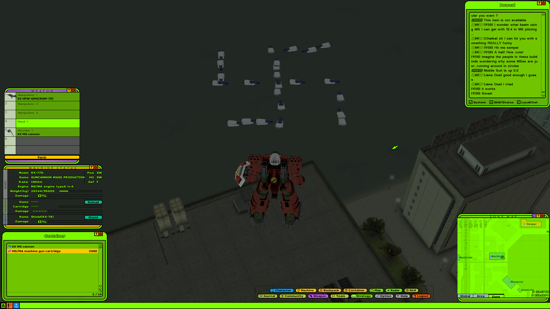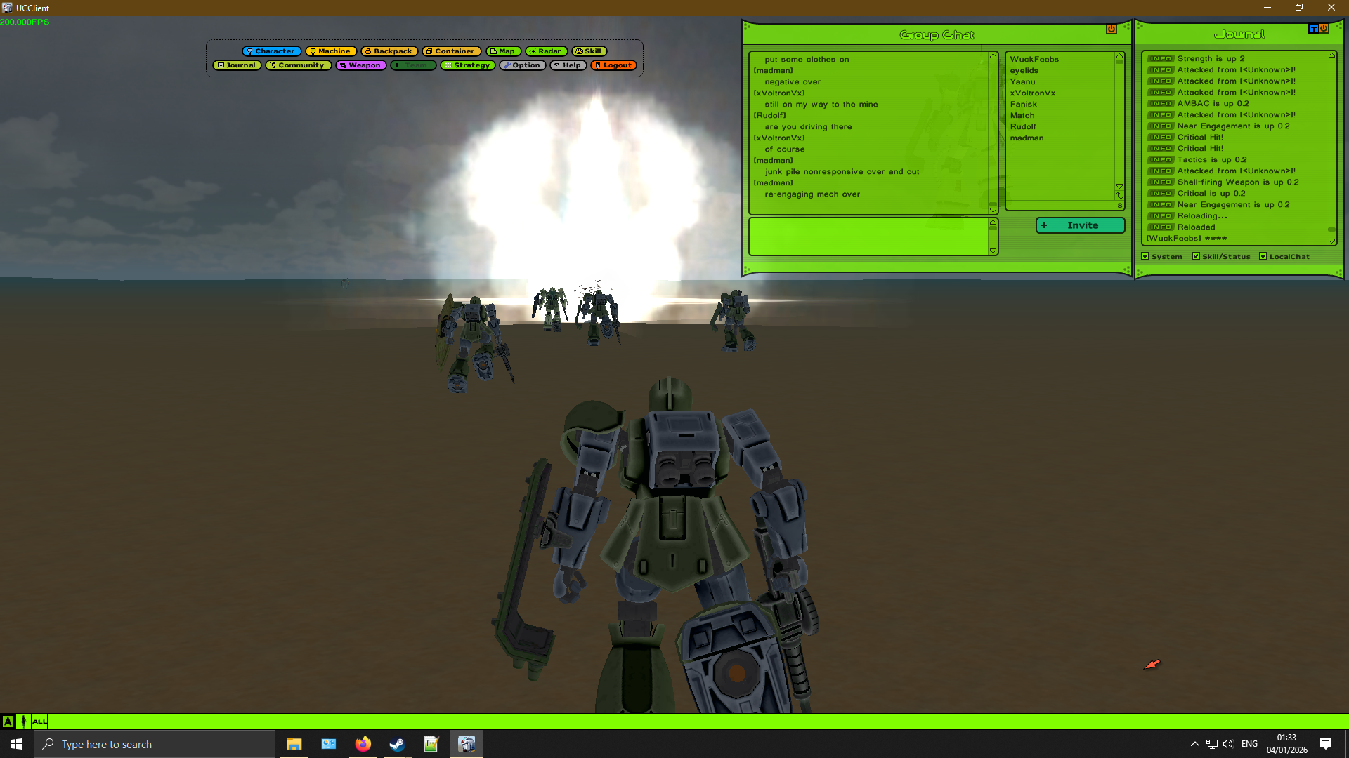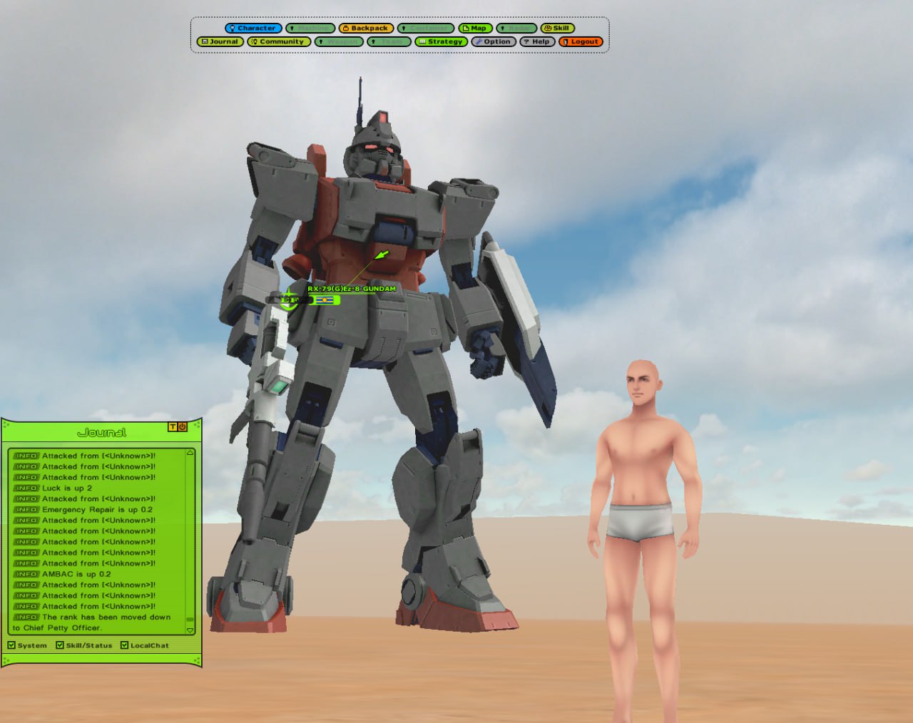 4chan's Bizarre MMOdventure is going to play Universal Century Gundam Online for the next two weeks. Come join in if you'd like.>What is it?An Ultima-like faction PvP MMO set in the Gundam universe, specifically during the One Year War. You level your character's skills and gather resources to improve your vehicles and mobile suits.>ServerUCGO Dawn of AustraliaGame files - https://mega.nz/file/6goAWbLT#UTSQmc4rki4ZZ7BgvOKpc5Ssw14GS7KaUkmkFTesKAoTranslation Patch + Updates - https://drive.proton.me/urls/3ABREQK03W#fEE5FtQlzJTmMake sure to launch the game with UCClient-ENG.exe, if you're on Windows and it doesn't work try launching it as administrator.>AccountCreating an account is done through the launcher, enter a username and password and it'll create the account if the name isn't taken. Make sure not to forget your account info because there might not be a way to recover it.>FactionPrincipality of Zeon>GuildNo guild just yet, one will be made soon.>MiscDOA Wiki: https://w.atwiki.jp/ucgodoa/UCGOHost Wiki: https://wiki.ucgohost.com/index.php/Main_PageBizarre MMOdventure Thread: >>>/vm/2051131