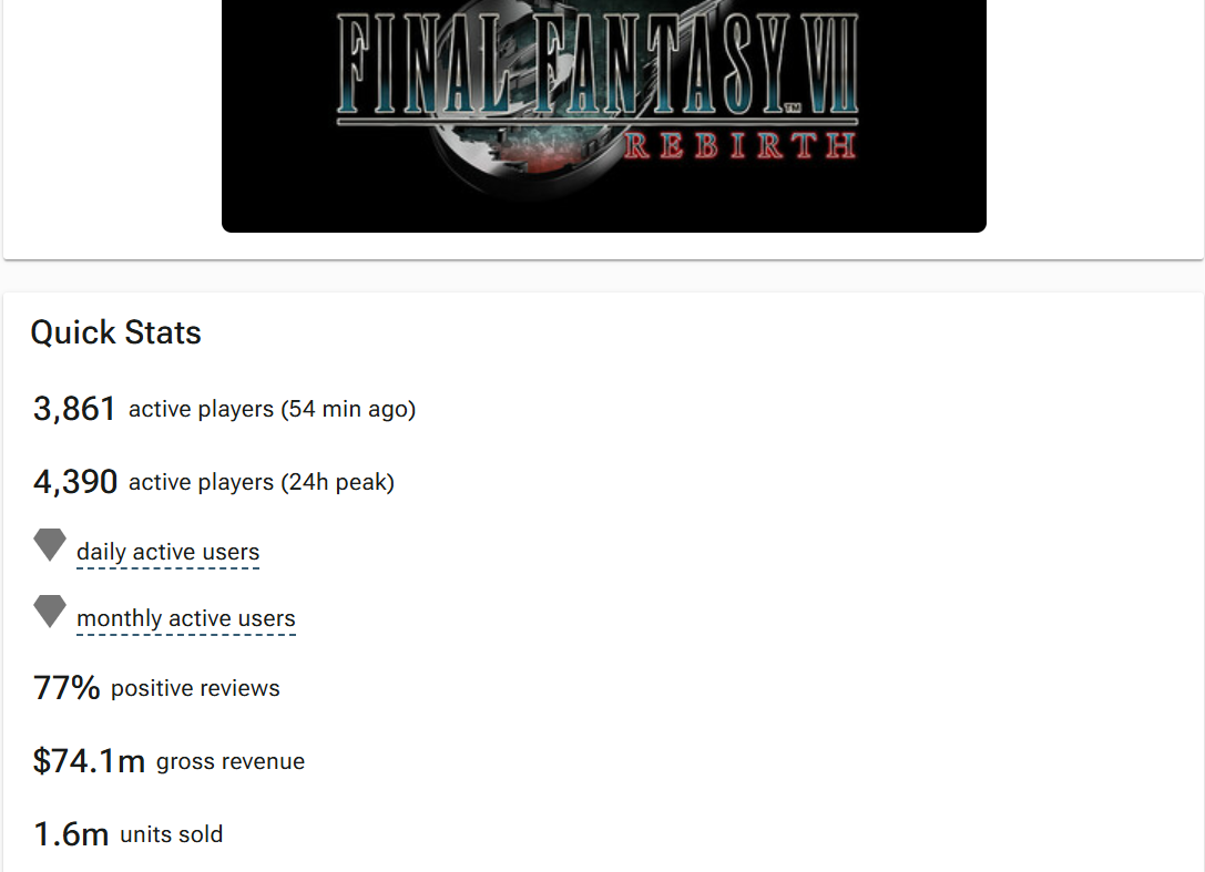 >>730049935That's an edit. Digimon only shows 600k and Steam has it above Rebirth in their top 100.Even if it was accurate 262k + 1.6m is still less than 2 million.https://gamalytic.com/game/1984270