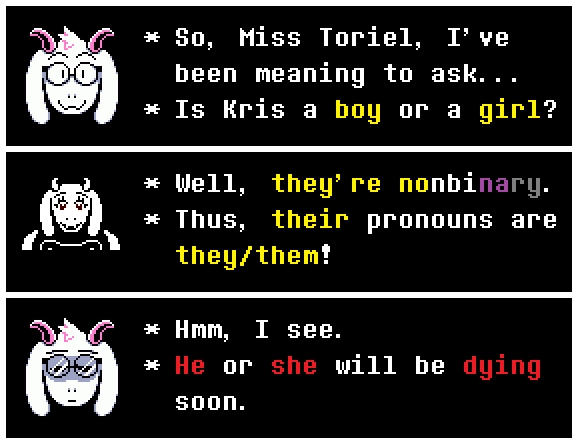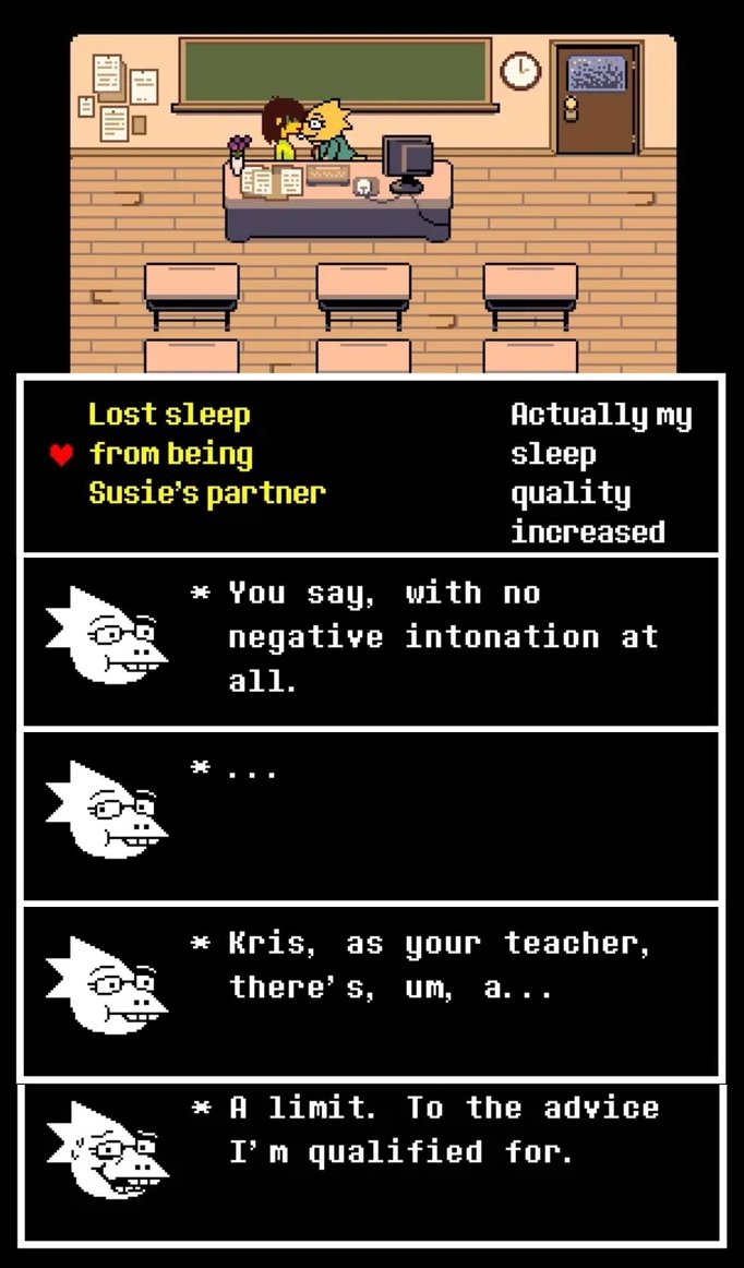 >>730104491why would Kris' soul know about the events of Undertale such that you make dialogue choice references to it