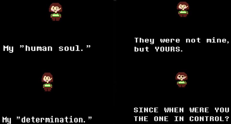 >>730104491Gaster SURVEY_PROGRAM shenanigans + strong implication that the SOUL we inhabit does not belong to/is alien to Kris and beyond his control.
