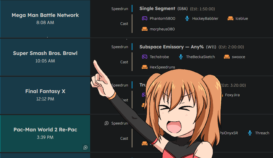 Schedule: https://gamesdonequick.com/schedule/62
