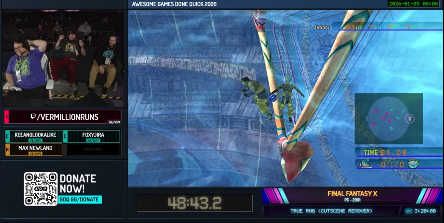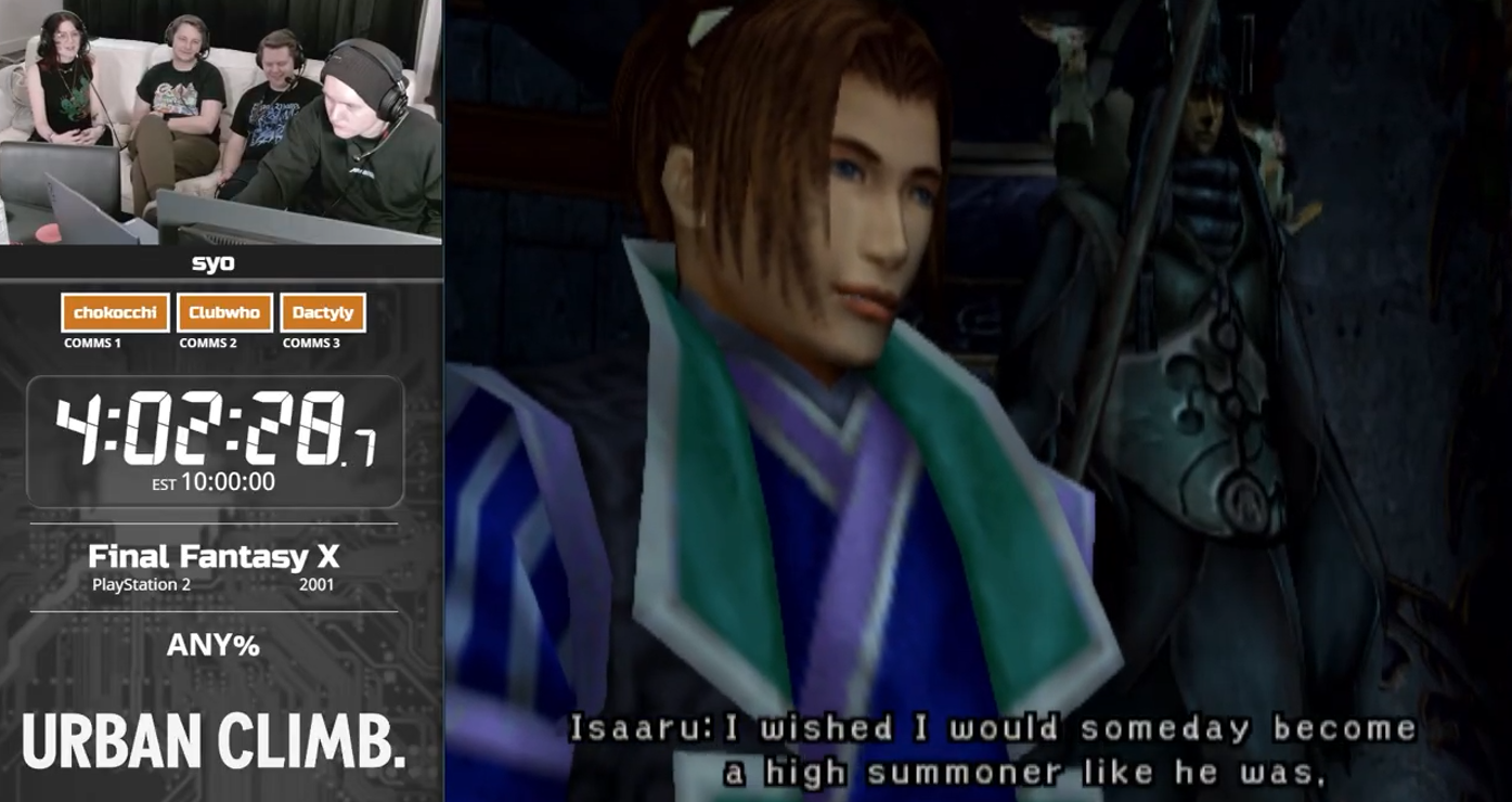 Now: Final Fantasy XNext: Pac-Man World 2 Re-PaLater: Dragon Ball Z: BudokaiStreams: https://www.youtube.com/live/IzylNJUIGwc | https://www.twitch.tv/gamesdonequickSchedule: https://gamesdonequick.com/schedule/62Previous: >>730084909
