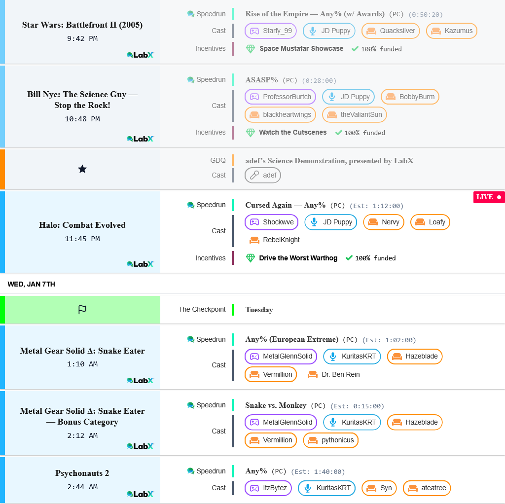 Now: Halo: Combat EvolvedNext: Metal Gear Solid Δ: Snake EaterLater: Metal Gear Solid Δ: Snake Eater — Bonus CategoryStreams:https://youtu.be/IzylNJUIGwchttps://www.twitch.tv/gamesdonequickSchedule:https://gamesdonequick.com/schedule/62Previous: >>730210342