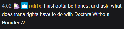 >it's going to say trans rights on the screen every 30 secondsYeah surely people won't get tired of this. Isn't this supposed to be a cancer event?
