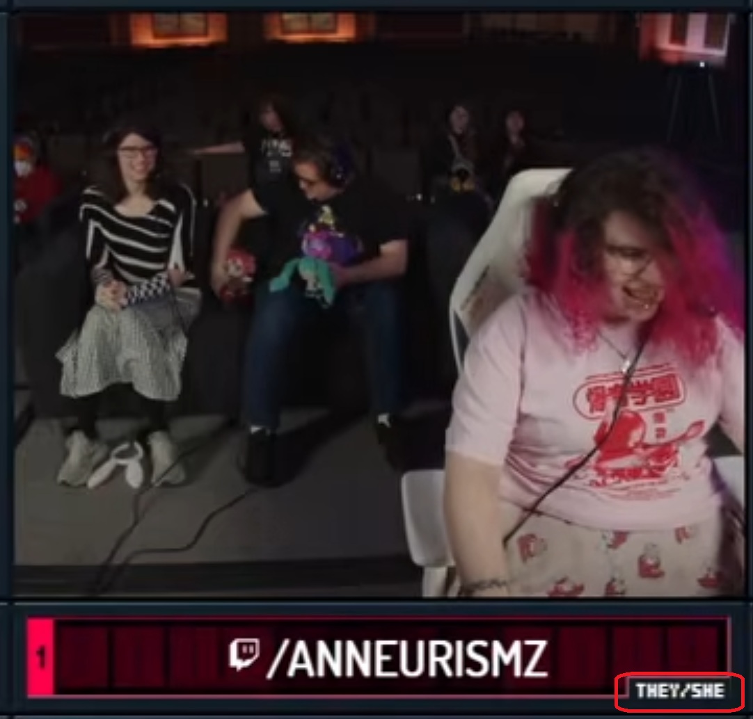 >>730415461>putting the pronouns in but choosing nonsensical ones on purpose, or refusing to choose by picking all three / "any" is the sneaky move that doesn't have a hard counter. idk man i think you're them too much credit. yes i'm sure its possible once, maybe even twice, that someone just did that to fuck around, but we've seen unironic "fae/faer" and "it/its"* from people that absolutely look like they would unironically go by those pronouns.*such as protomagicalgirl, who might be the genesis of tranny freakdom in GDQ, who identified as a "multiple gear system" with multiple personalities with their own pronouns inhabiting his body - basically schizophrenia at that point