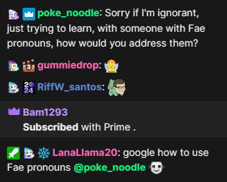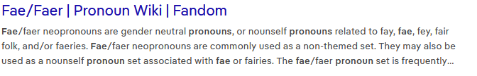 >>730415910>>730415984Has anyone ever even heard someone use this pronouns? Like I've seen them on stream and twitter and stuff but I've never seen anyone "so now IT is doing a skip" "what fae is doing here is manipulate the framerate" "Xir is my best friend" etc I have literally never even heard anyone say these. It's like they just sparkly accessories for your online profile